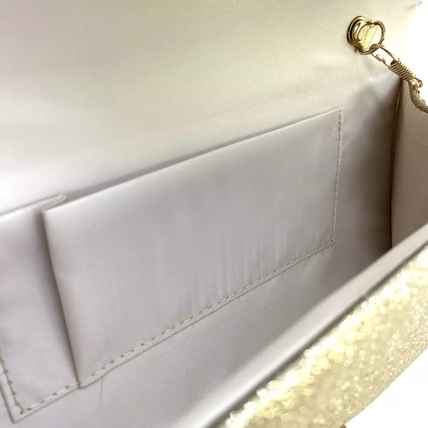 Festligt skimrande väska täckt i ett vackert glimrande tyg. Väskan har en metallkedja i silver och kan bäras på axeln, tvärs över bröstet – eller tas bort enkelt om man hellre vill ha en hand-clutch. En ficka invändigt och matchande foder. Väskan stängs med ett magnetlås.