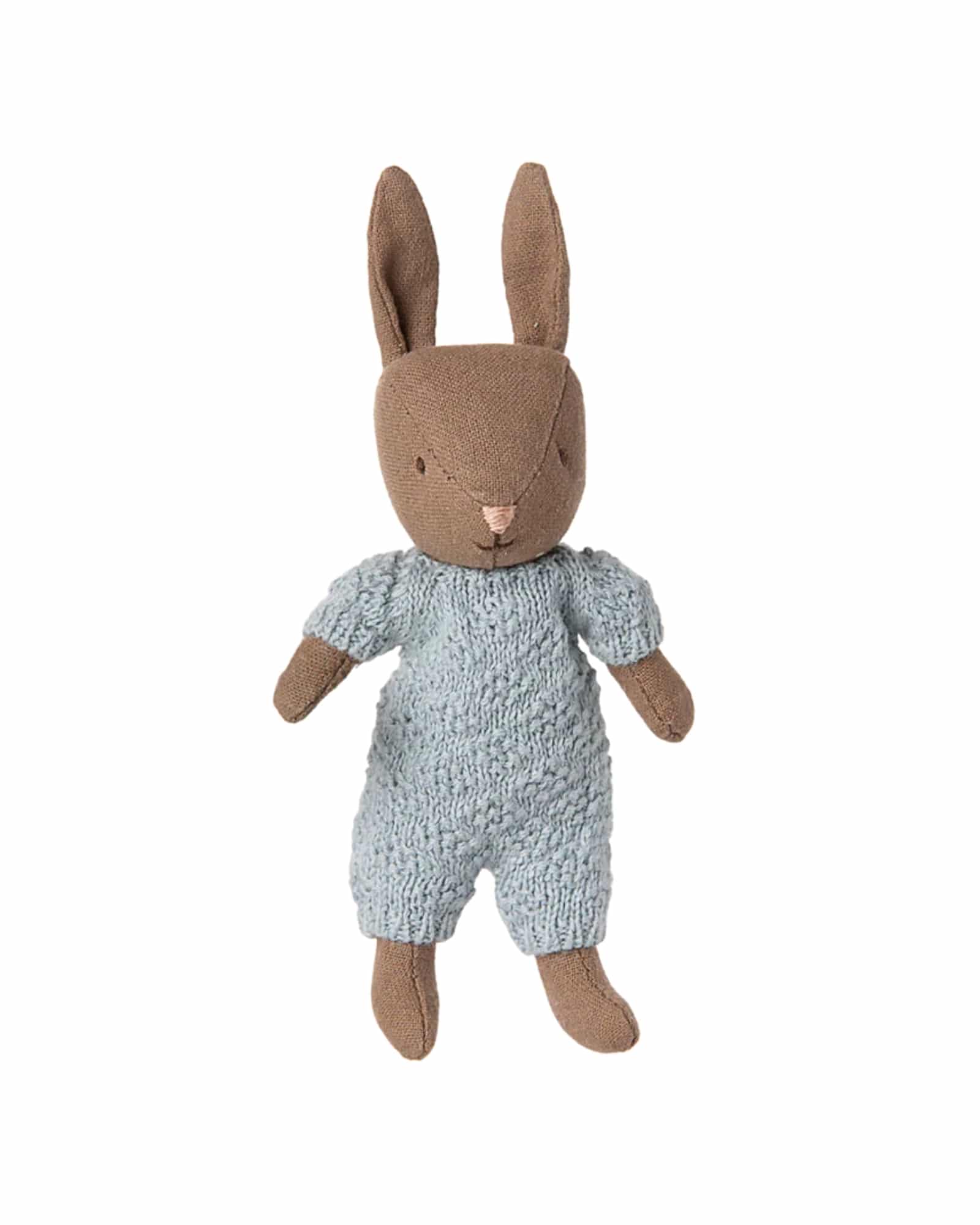 Maileg brun kanin i blå stickad kostym – med magneter i händerna