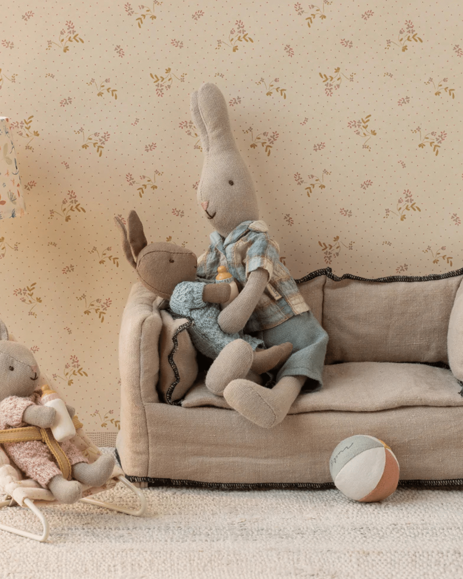 Låt fantasin flöda med denna söta lilla kanin från Maileg. Den bruna kaninen bär en mjuk, blå stickad kostym som ger den ett tidlöst och charmigt utseende. Den är gjord av mjuka och barnvänliga material, perfekt för små händer. Kaninen är i storlek Micro, vilket gör att den passar ihop med många av Mailegs möbler och tillbehör. I kaninens händer finns små magneter. Det gör att den kan hålla i metalliska tillbehör och enkelt poseras på olika sätt. Detta gör leken ännu roligare och mer fantasifull. Kaninen passar perfekt i Mailegs House of Miniature-dockhus. Där kan den bo tillsammans med andra små vänner. Det är en underbar present till barn som älskar att leka och skapa berättelser. Samlare som uppskattar kvalitetsleksaker med personlighet kommer också att tycka om den. Kaninen är robust och håller länge, vilket gör den till en trogen följeslagare under många lekstunder.