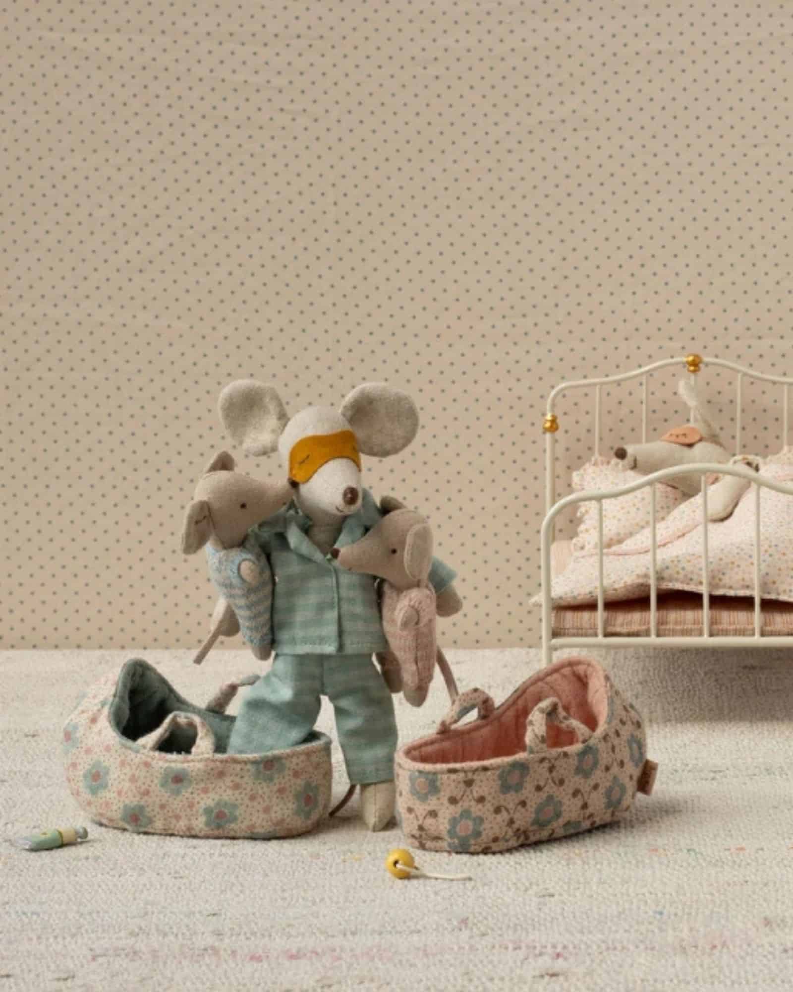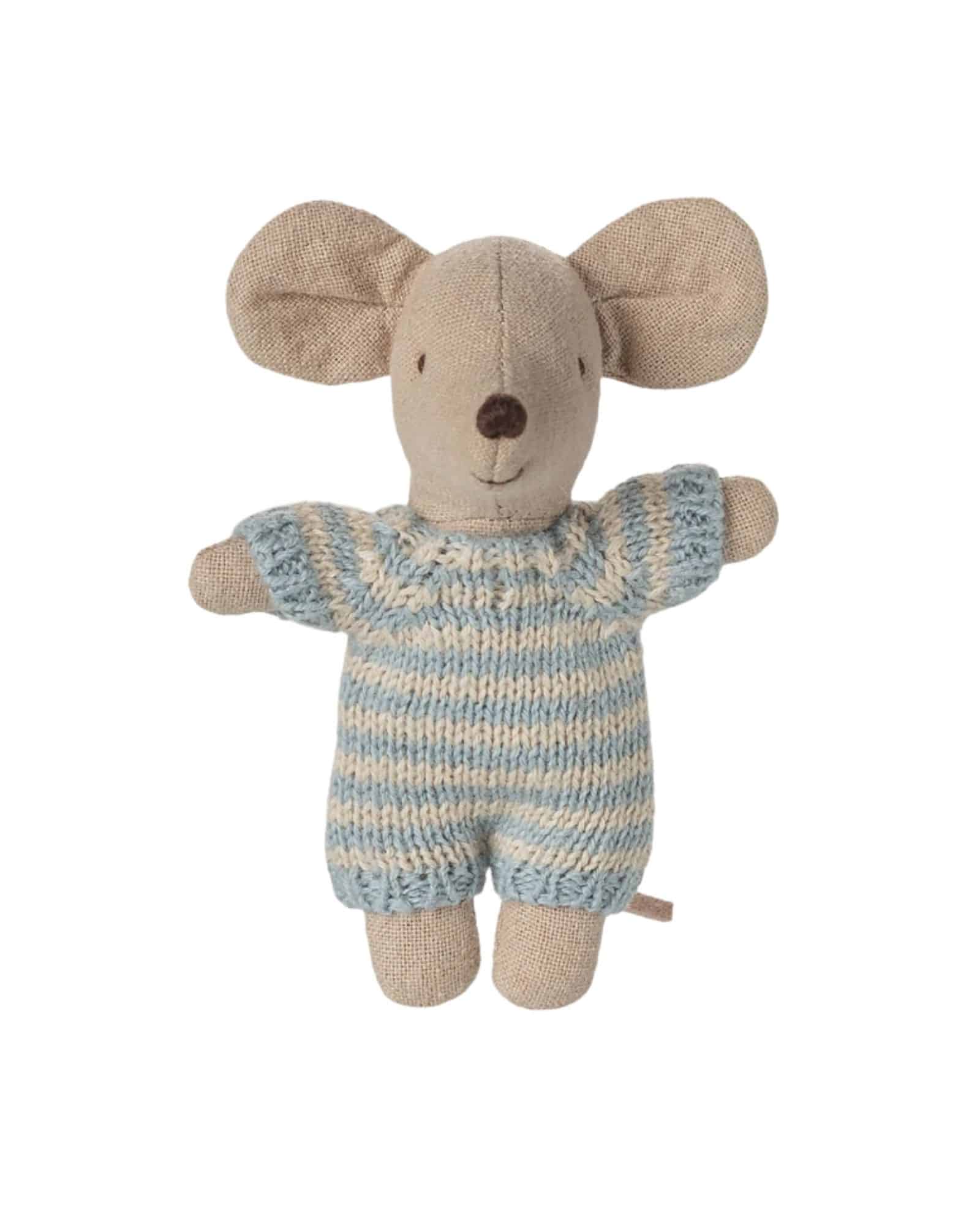 Maileg babymus i blå liggdel – en liten mus i randig stickad dräkt som sover sött i sin quiltade bädd.