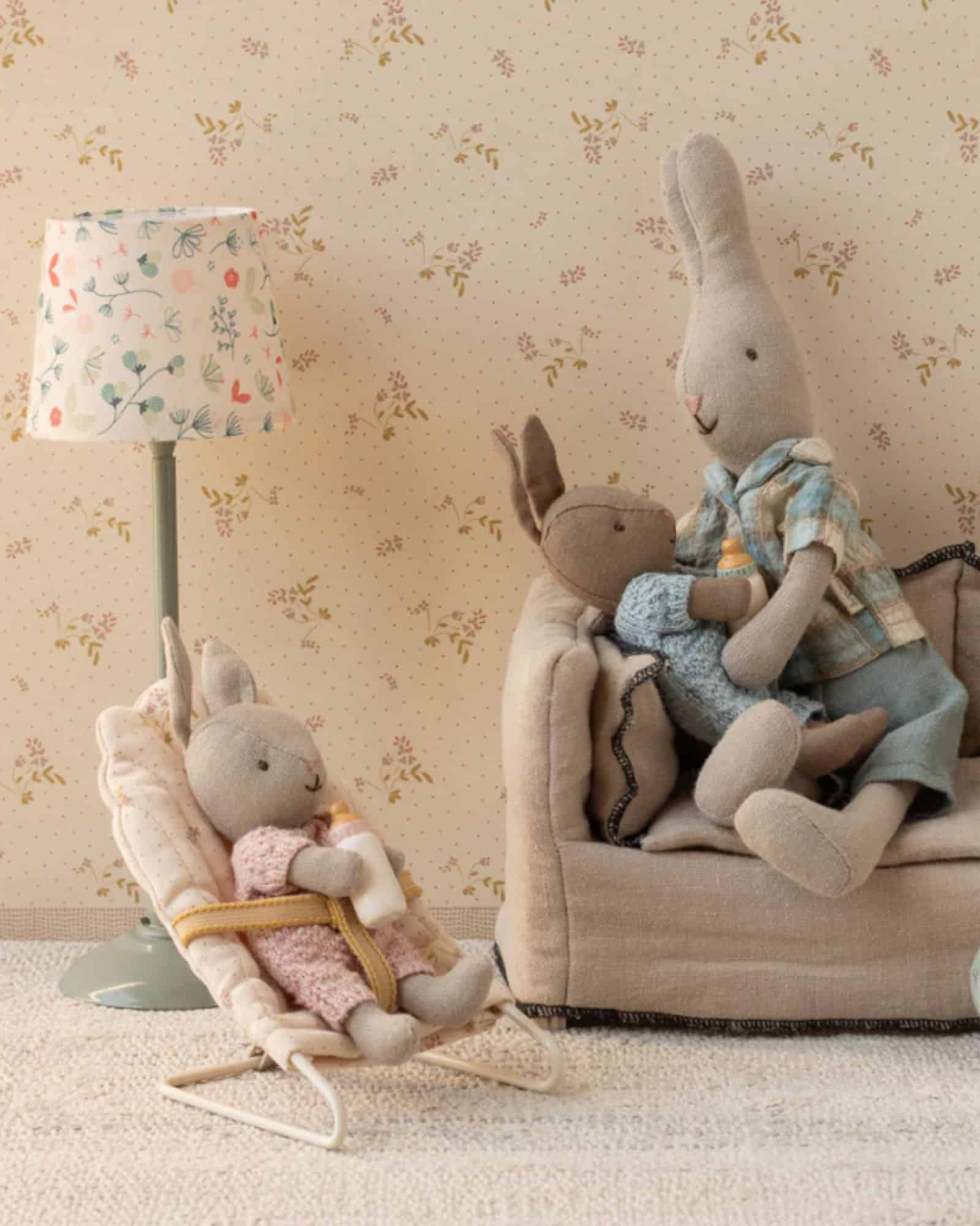 Babysittern passar perfekt för de allra minsta figurerna i Mailegs värld, särskilt mikrostora kaniner. Här kan de gungas till sömns eller bara sitta bekvämt medan de större figurerna leker. Det är ett tillbehör som uppmuntrar till kreativ lek, omsorg och vardagsnära berättelser.