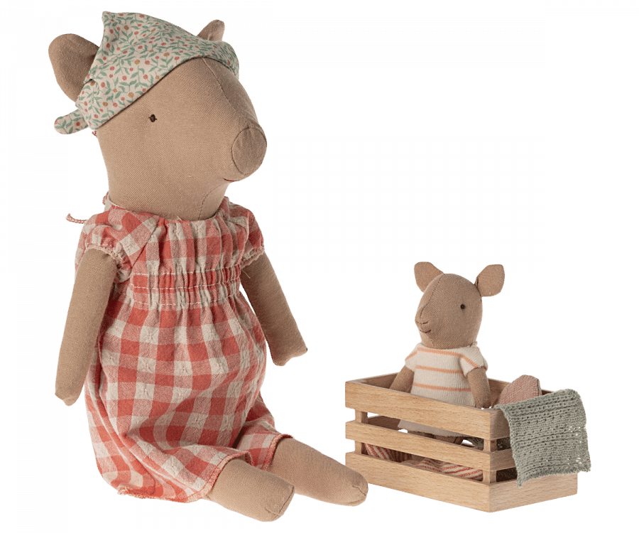 Oink Oink – säg hej till den sötaste grisen. Den här grisen kommer i en vacker klänning och halsduk och kan sitta på egen hand!