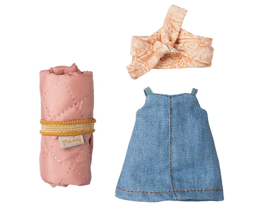 Denna mus är väl förberedd för en vandring i den vilda naturen. Hon är klädd för dagars promenader och tar med sin sovsäck för nätter under stjärnorna. Hon har magneter i händerna