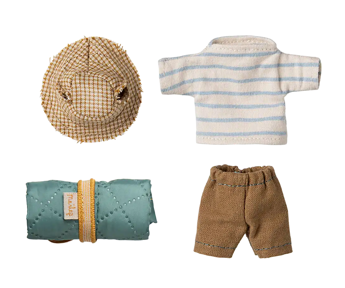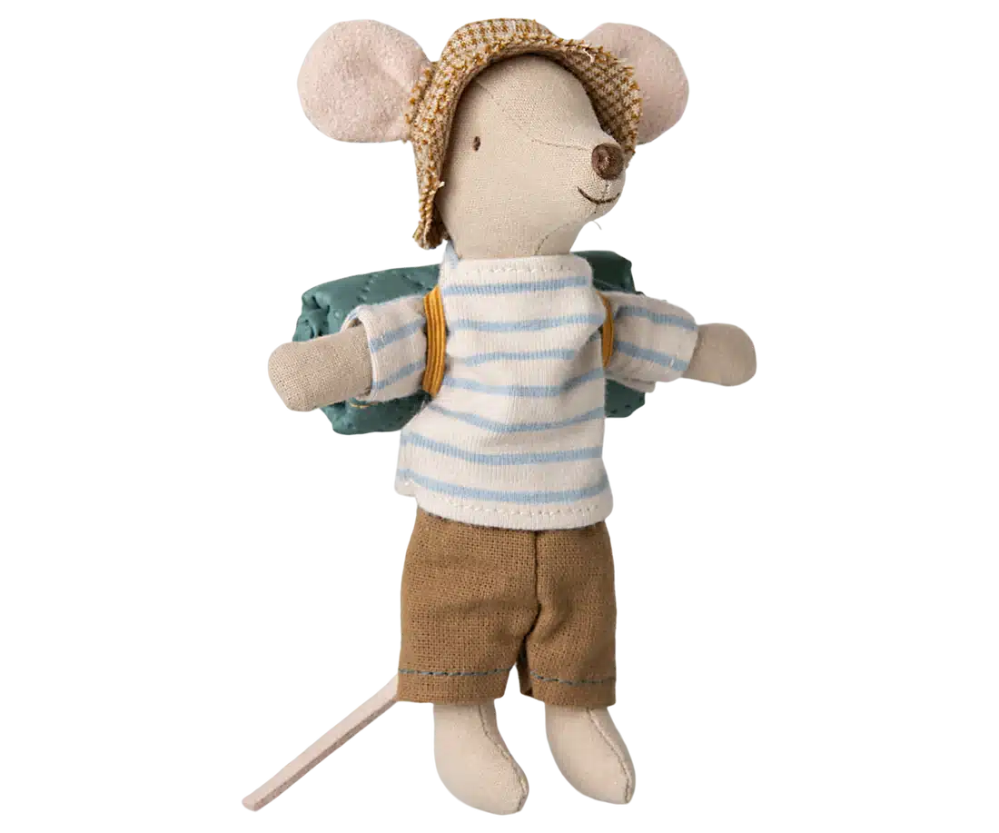 Denna mus är väl förberedd för en vandring i den vilda naturen. Han är klädd för dagars promenader och tar med sin sovsäck för nätter under stjärnorna. Han har magneter i händerna. Lägg till fler tillbehör från hiker-kollektionen för mer lek.