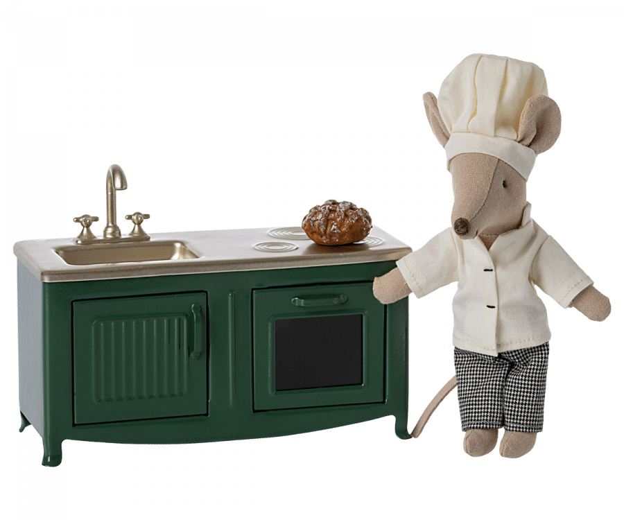 Hjärtat i varje hem är köket. Detta metallkök har en vacker färgton och har många lekfulla detaljer som skåplucka, diskbänk och ugn med nybakad paj. Den är perfekt i storleken för musfamiljen.
