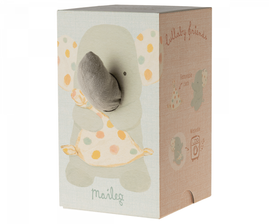 Lullaby friends är en samling vackra föremål för bebisar. Denna elefant har en mjuk filt och kommer att spela Mozarts vaggvisa när du drar i svansen. Den är gjord i mjuka tyger med unika tryck och förpackad i en vacker presentförpackning.