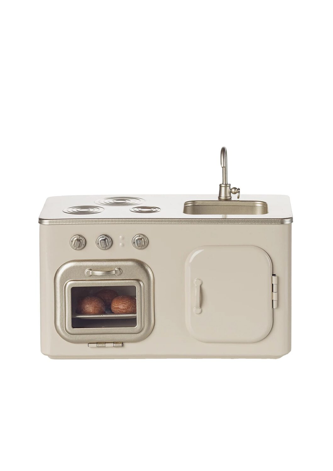 Charmigt miniatyrkök för Maileg-hus i metall och polyresin, komplett med ugn och tre nybakade bullar. Perfekt för lek från 3 år och enkelt att rengöra med yt-tvätt. Ger dockhuset extra realism och lekglädje.
