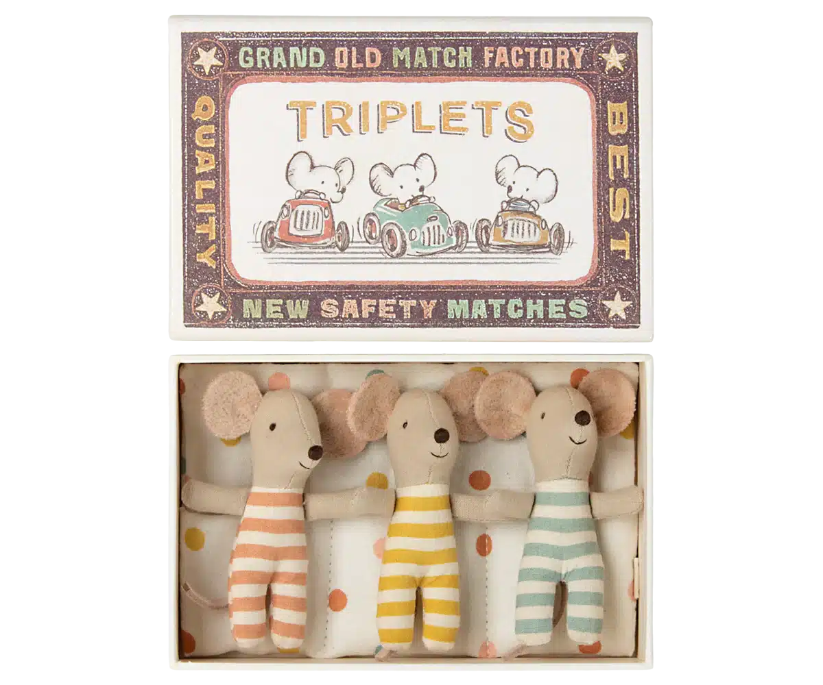 Ett klassiskt Maileg-objekt. Nu kan du ha tre babymöss samtidigt. Stoppa trillingmössen försiktigt i sin tändsticksasksäng i den varma sovsäcken där de sover tätt sida vid sida. Dessa möss passar alla tillbehör i storlek babymus.