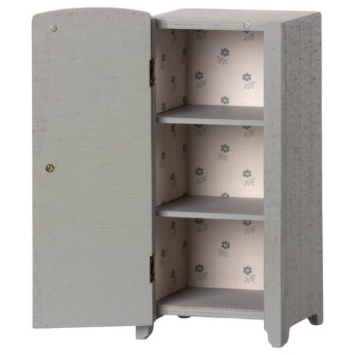 Denna garderob som ser vintage ut har ett vackert präglat blomtryck på framsidan och vacker tryckt tapet inuti. Hyllorna inuti kommer att se till att arrangörsspelet börjar. Denna garderob passar in i Maileg dockskåp.