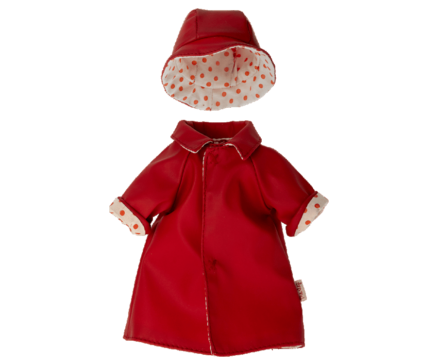 Ett vackert set regnkläder som passar nallemamma. Det kommer säkert att hålla henne torr under regniga dagar. Detta set består av en kappa och en hatt.