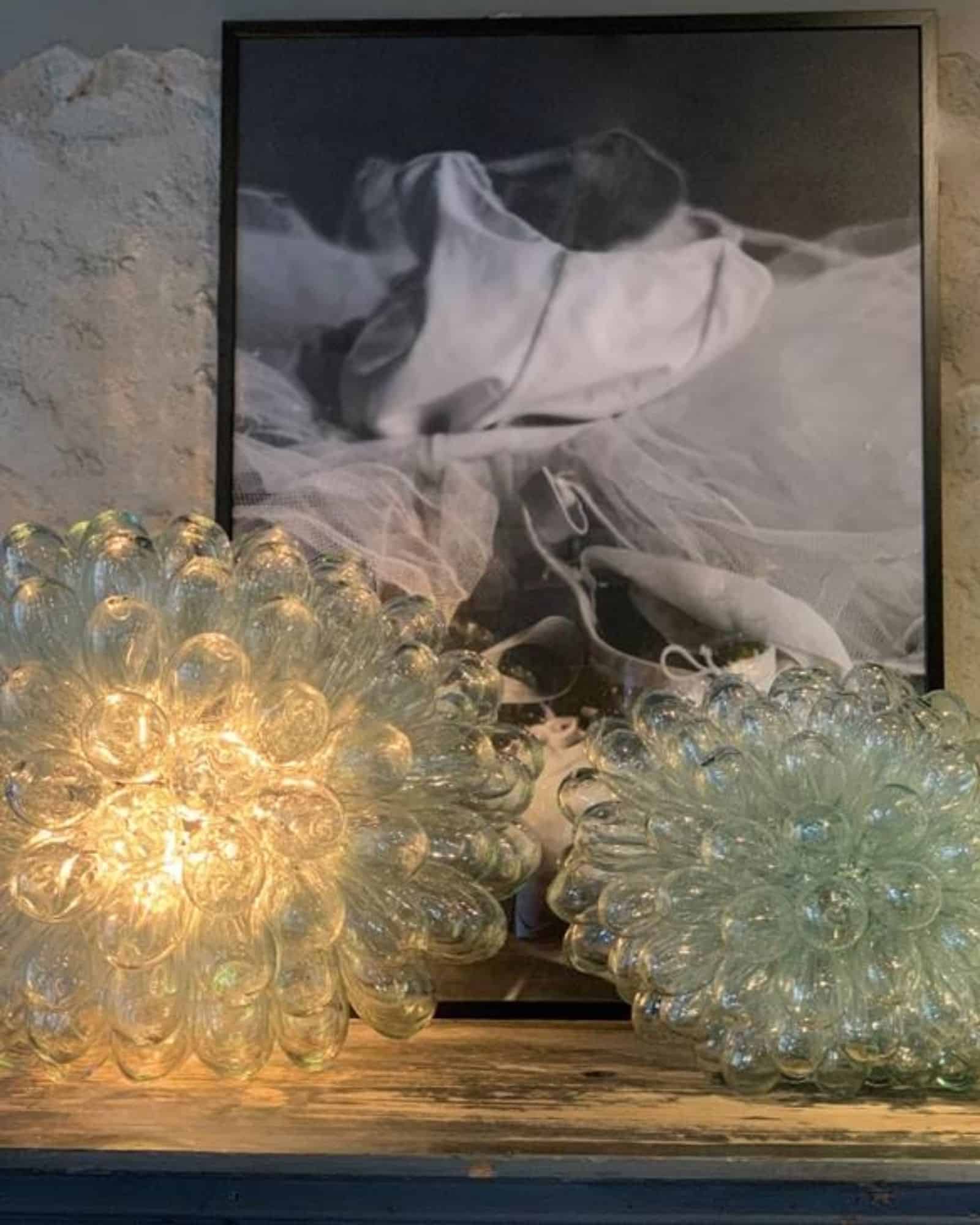 Grapelampan kan användas både som dekorativ skulptur och som belysning. En elkabel medföljer så att du enkelt kan förvandla klustret till en stämningsfull lampa. Placera den i ett fönster, på en hylla, direkt på golvet eller hängande i ett hörn – ljuset som filtreras genom glaset ger ett poetiskt skimmer till rummet.