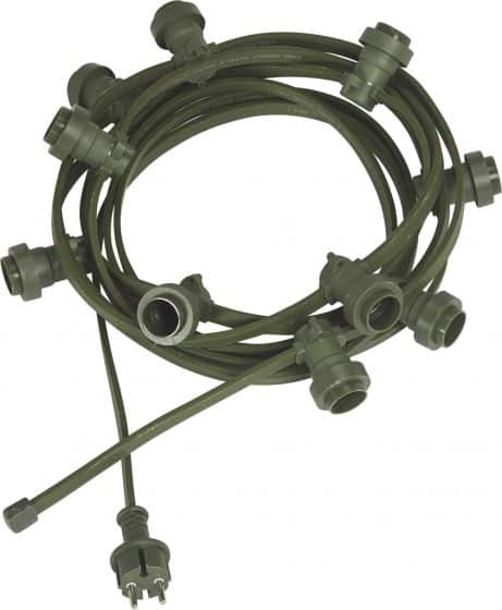 En snygg och stilren khakigrön ljusslinga med 10 st lamphållare E27. Ljusslingan är 7 meter lång och det är 2,5 meter till första lamphållaren, därefter är det 0,5 meter emellan dem
