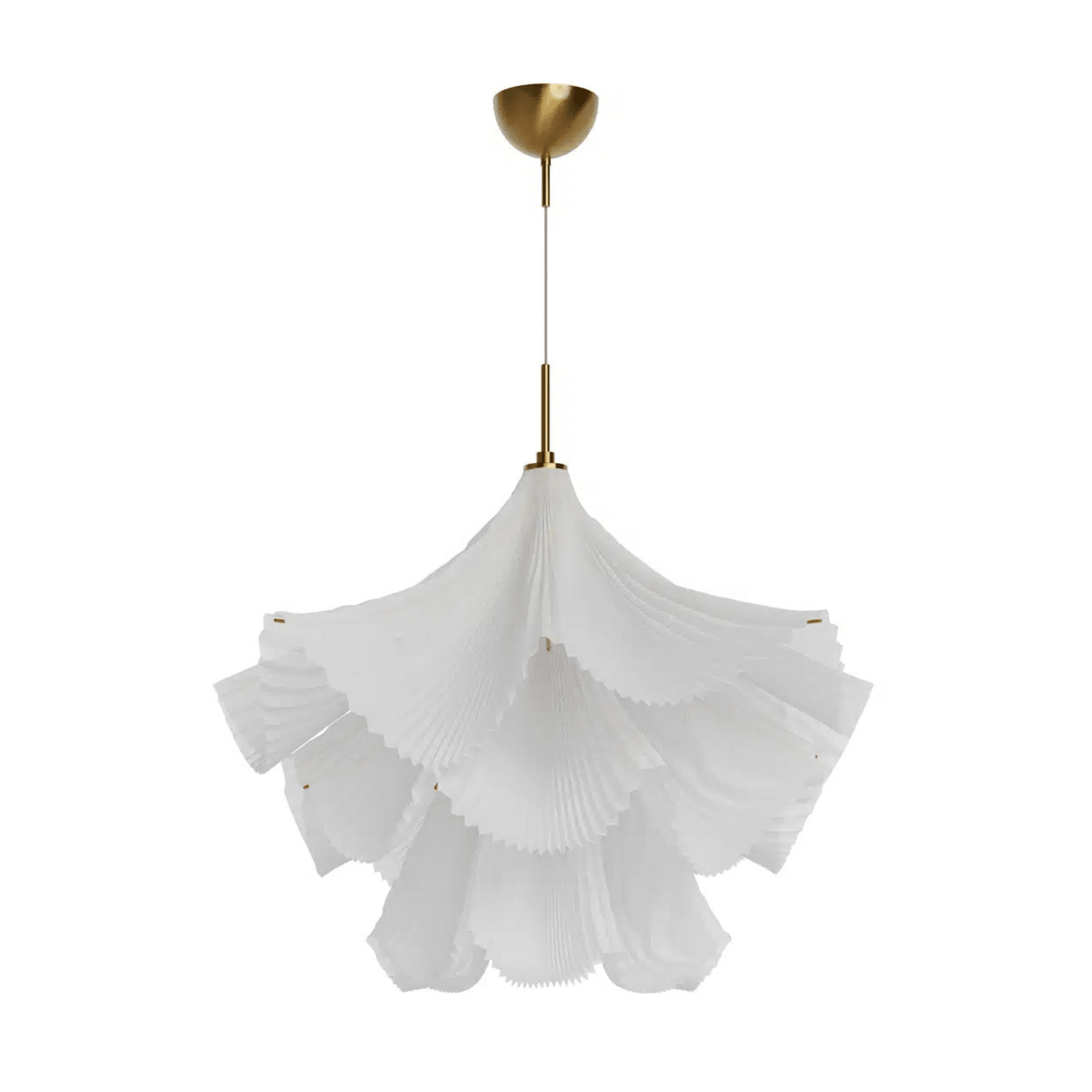 Juliette taklampa Ø75 cm skapar omedelbart en harmonisk och drömsk atmosfär i rummet. Den plisserade tyllen i tre lager formar ett mjukt och luftigt uttryck, samtidigt som materialet filtrerar ljuset på ett varmt och inbjudande sätt. Mässingsdetaljerna lyfter dessutom den vita tyllens struktur och ger lampan en sofistikerad karaktär som stärker helhetsintrycket.