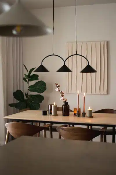 Curve 3 är en snygg taklampa från Globen Lighting, resultatet av en lek med geometriska former där de mjuka rundade bågarna möter de skarpa triangulära linjerna på skärmarna. Denna lampa är tillverkad av mattlackerad metall med tre stycken metallskärmar samt två stycken 200 cm långa textilkablar med en matchande takkopp i metall. Kronkoppling för takanslutning medföljer ej.