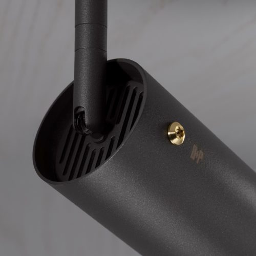 En spårstrålkastare gjord av grafitpulverlackerad metall med solida mässingsdetaljer.