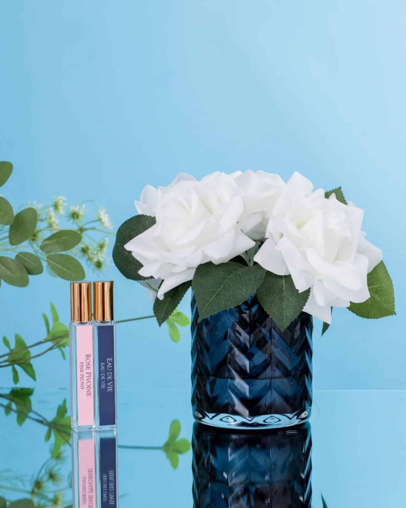 Varje ros formas varsamt för hand och får en naturlig ytbehandling som ger bladen en mjuk, livfull känsla. Blommorna doftsätts dessutom med två noggrant framtagna parfymer: