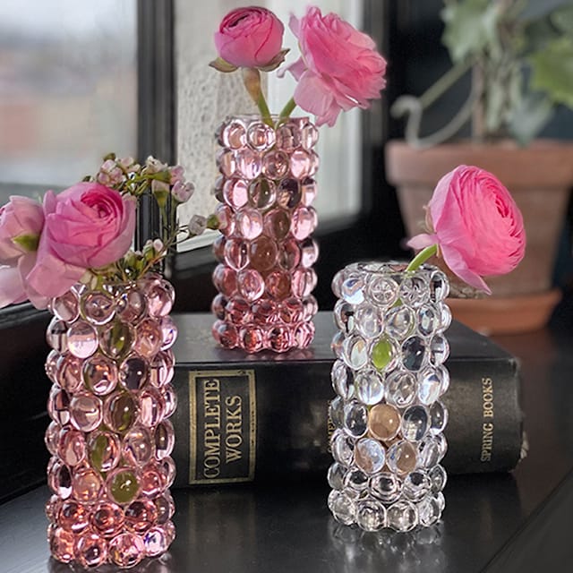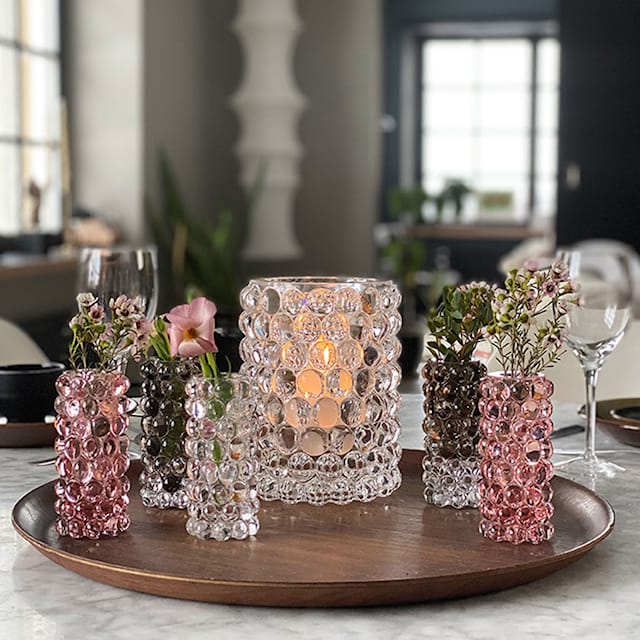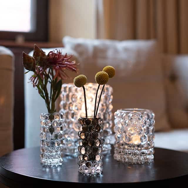 Hurricane Boule Mini Clear är en vas tillverkad i handblåst glas från det svenska varumärket Skogsberg & Smart. Vasens yta är fylld med optiska bubblor som gör att den får ett skimrande ljus i stilmässigt släktskap med 1970-talets glasdesign. Boule finns i flera olika färger och storlekar vilket ger ett intressant bidrag till inredningen i vilket hem som helst. Bubblorna uppstår i tillverkningsprocessen när man blåser glasmassan i en gjutjärnform som sedan formas för hand. Varje vas får ett unikt mönster och en lyxig tyngd. Vaserna är munblåsta i landskapet Böhmen i Tjeckien.