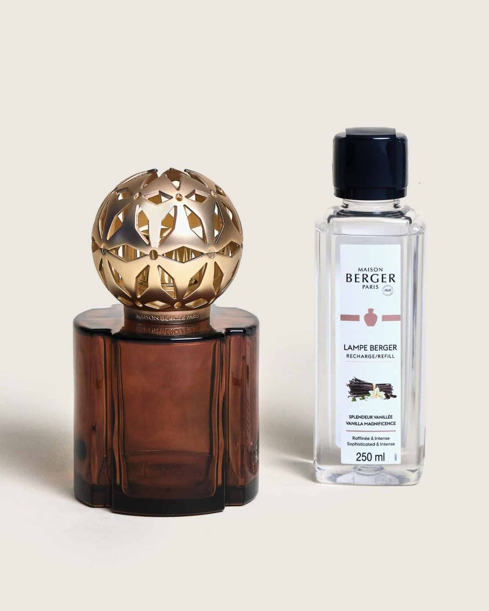 Maison Berger Pomelis Chocolat gåvoset Vanilla Magnificent. Chokladbrun doftlampa i elegant design med gyllene detaljer och 250 ml av den varma och sensuella doften Vanilla Magnificent.