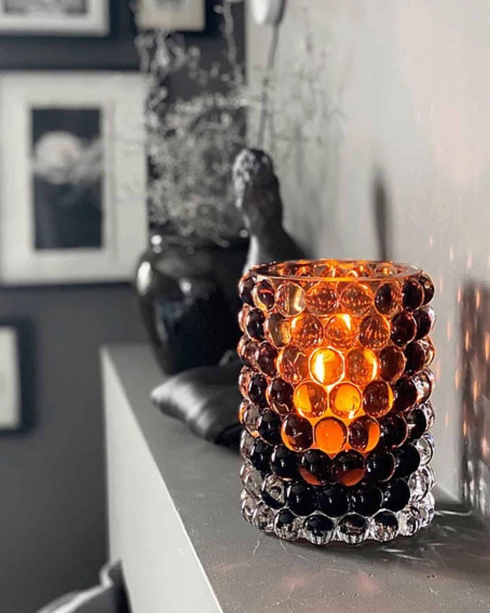 Ytan formas med hjälp av en gjutjärnsform som skapar de karakteristiska bubblorna. Dessa bubblor ger varje lykta ett unikt optiskt mönster och en nästan skulptural känsla. Glasets struktur fångar och reflekterar ljuset på ett sätt som skapar ett varmt och levande sken när du tänder ett ljus, vilket bidrar till en inbjudande atmosfär i rummet.