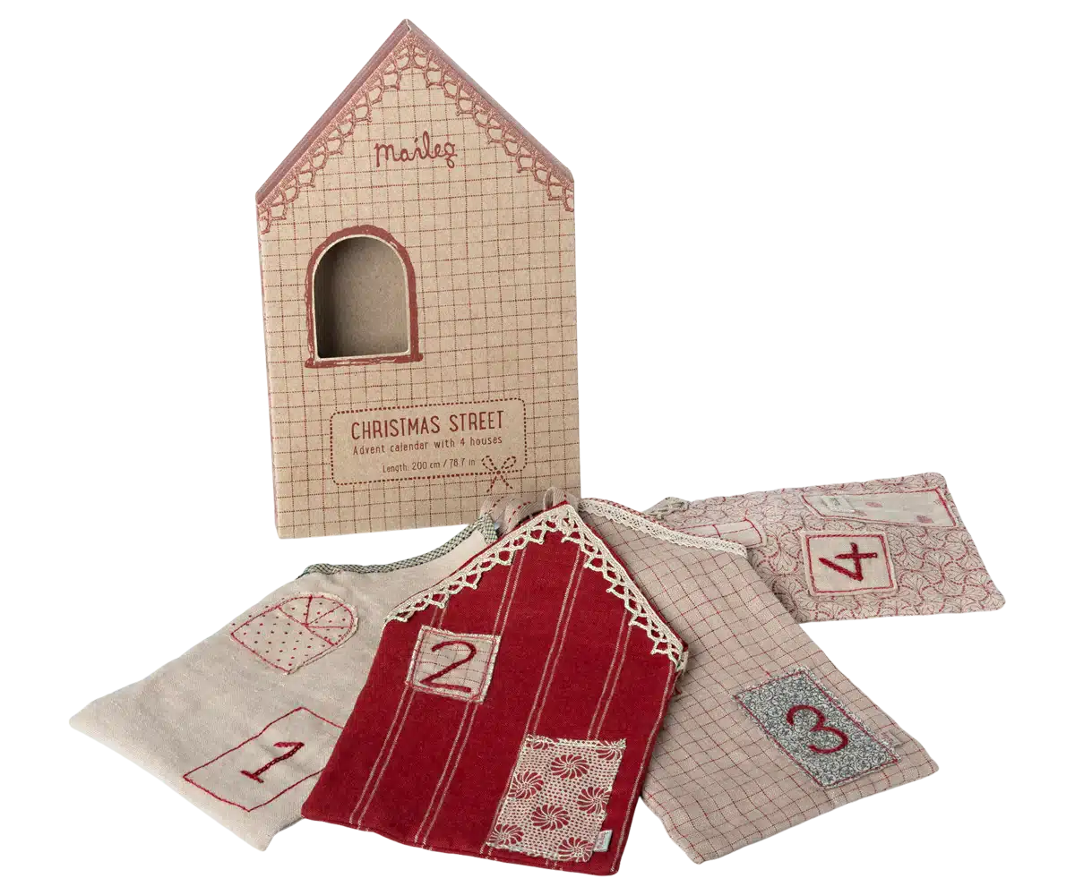 Denna kalender är gjord för de traditionella adventspresenterna. Lägg in små presenter i husen och packa upp en var och en av de sista 4 söndagarna före jul. Husen är gjorda med vackra broderade detaljer.