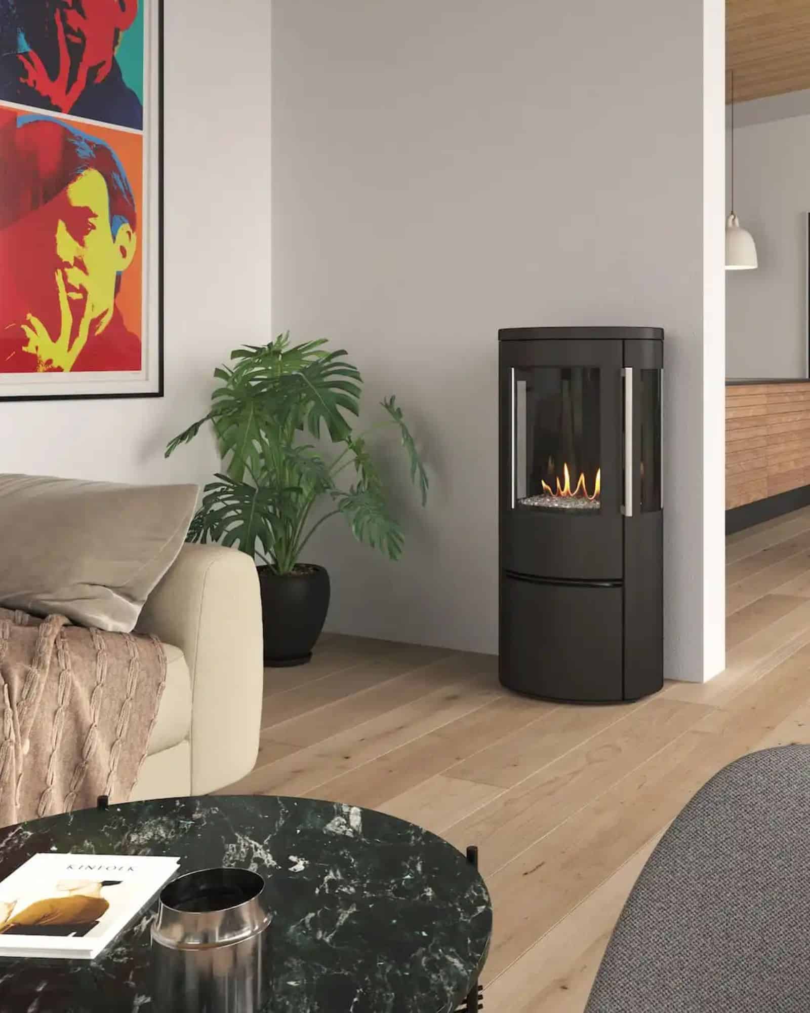 En bioetanolkamin brinner med riktiga lågor men helt utan rök. Det gör denna kamin mycket lättmöblerad, det enda du behöver är ett vanligt eluttag. I sockeln finns en behållare på 5 liter som gör att kaminen har över 20 timmars brinntid på lägsta nivån.
