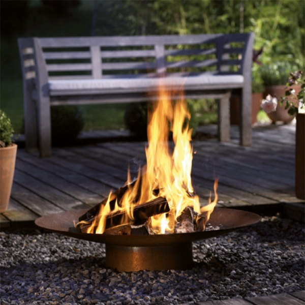 Det här är ett gediget eldfat som inte går att skapa på ett enklare sätt och som verkligen låter elden komma till sin rätt. Fatet ligger löst i ringen så att det kan justeras att ligga vågrätt eller med en lutning upp mot vinden. En vacker eldstad som sticker ut på ett stilfullt sätt oavsett placering. Tillverkad av högsta kvalitet – det obehandlade stålet har genomgått en oxideringsprocess under bar himmel: vind, temperatursvängningar och regn har gemensamt bidragit till den vackra patinan. Står bäst på ett underlag av jord, sten eller betong.