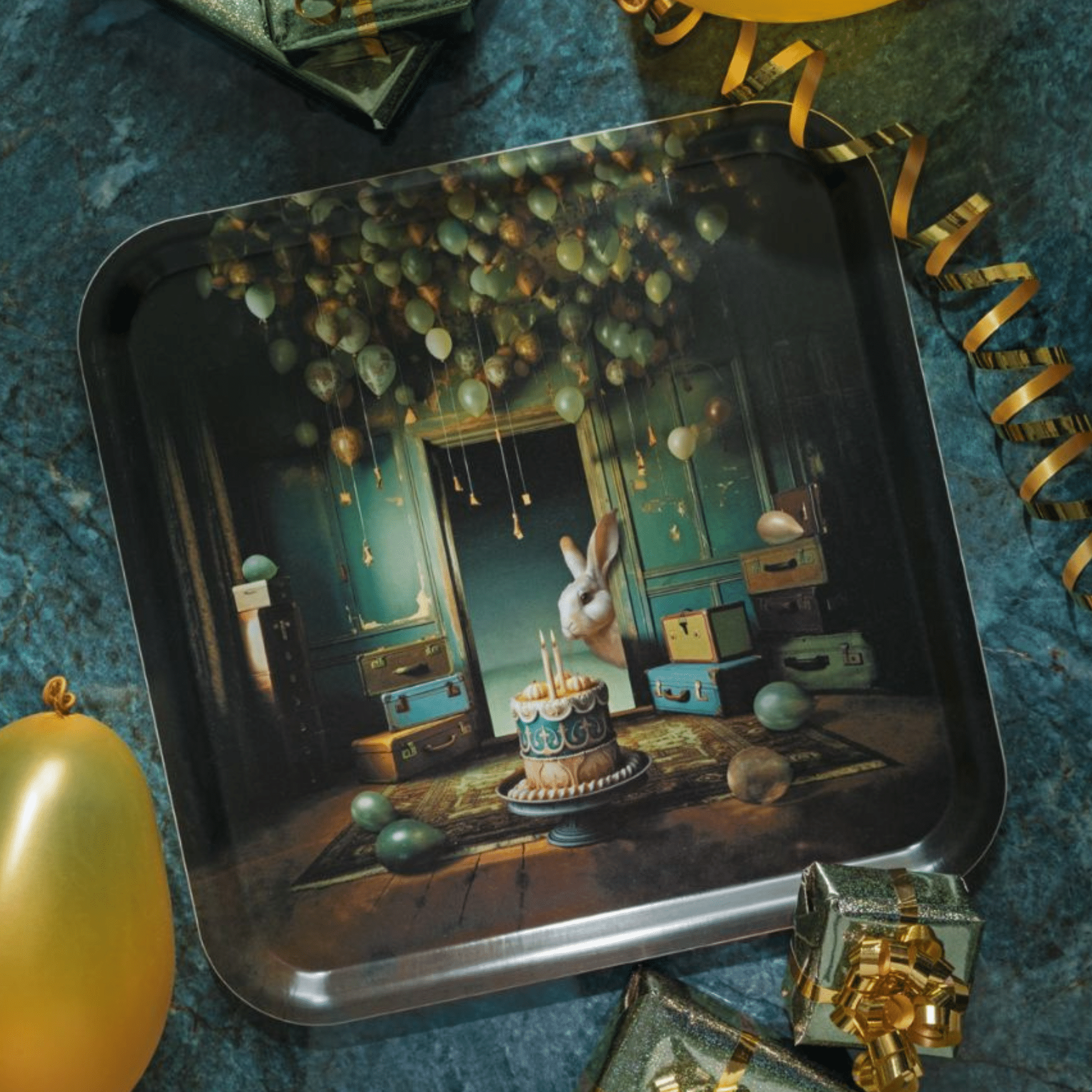 Bricka ”It’s My Party” av Maggie Taylor – handgjord på Öland i FSC-certifierat björkfanér med färgstark, surrealistisk design. Perfekt som serveringsbricka, dekoration eller present.