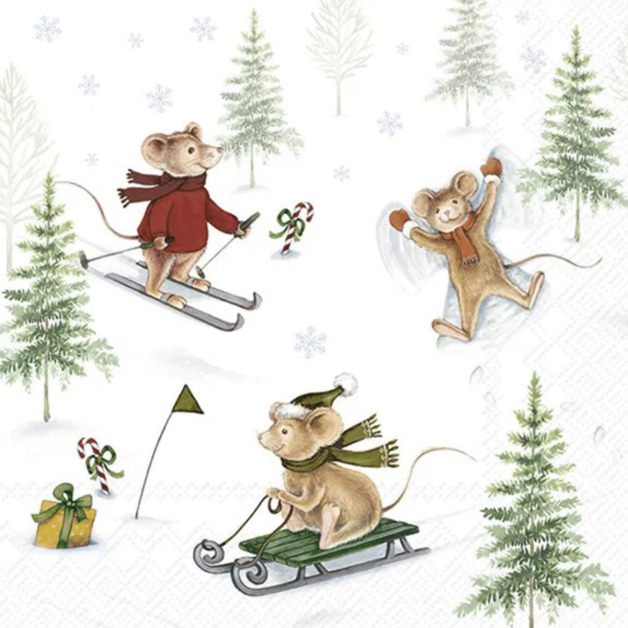 Motivet är fyllt av klassisk vinterromantik – tänk gnistrande snö, skrattande barn, snögubbar och pulkaåkning – vilket gör servetten till en hyllning till årstidens ljusa och glädjefyllda stunder. Dessutom är servetten designad för att skapa en varm, inbjudande och lekfull stämning, oavsett om du dukar upp för julfika, adventslunch eller helt enkelt vill förgylla vardagen med en känsla av vintermys.
