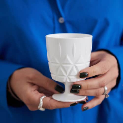 Dessa picknickglas är i akrylplast och tål att hänga med ut på picknicken, till havs, i skogen eller varför inte i uterummet. Picknickglasen på fot finns i en lyxig och krispig äggskalsvit färg med vackert kristallmönster. Det här glaset använder vi gärna till saften men också till drinken en varm sommarkväll. Finns även i klar plast. Levereras i 4-pack.