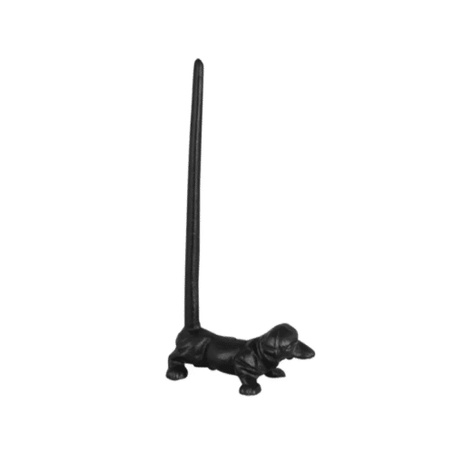 Hushållspappershållare i form av en hund, tillverkad i gjutjärn/smide.