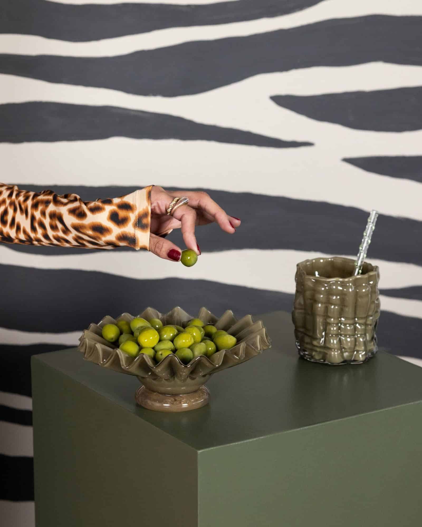 Skål Lori M i grön/beige från Byon är en riktig designpärla. Med sin plisserade form och skulpturala siluett påminner den om en blomma som just håller på att slå ut. Formen hämtar inspiration från modevärldens klassiska kjolar, men här översatt till keramikens poetiska uttryck.