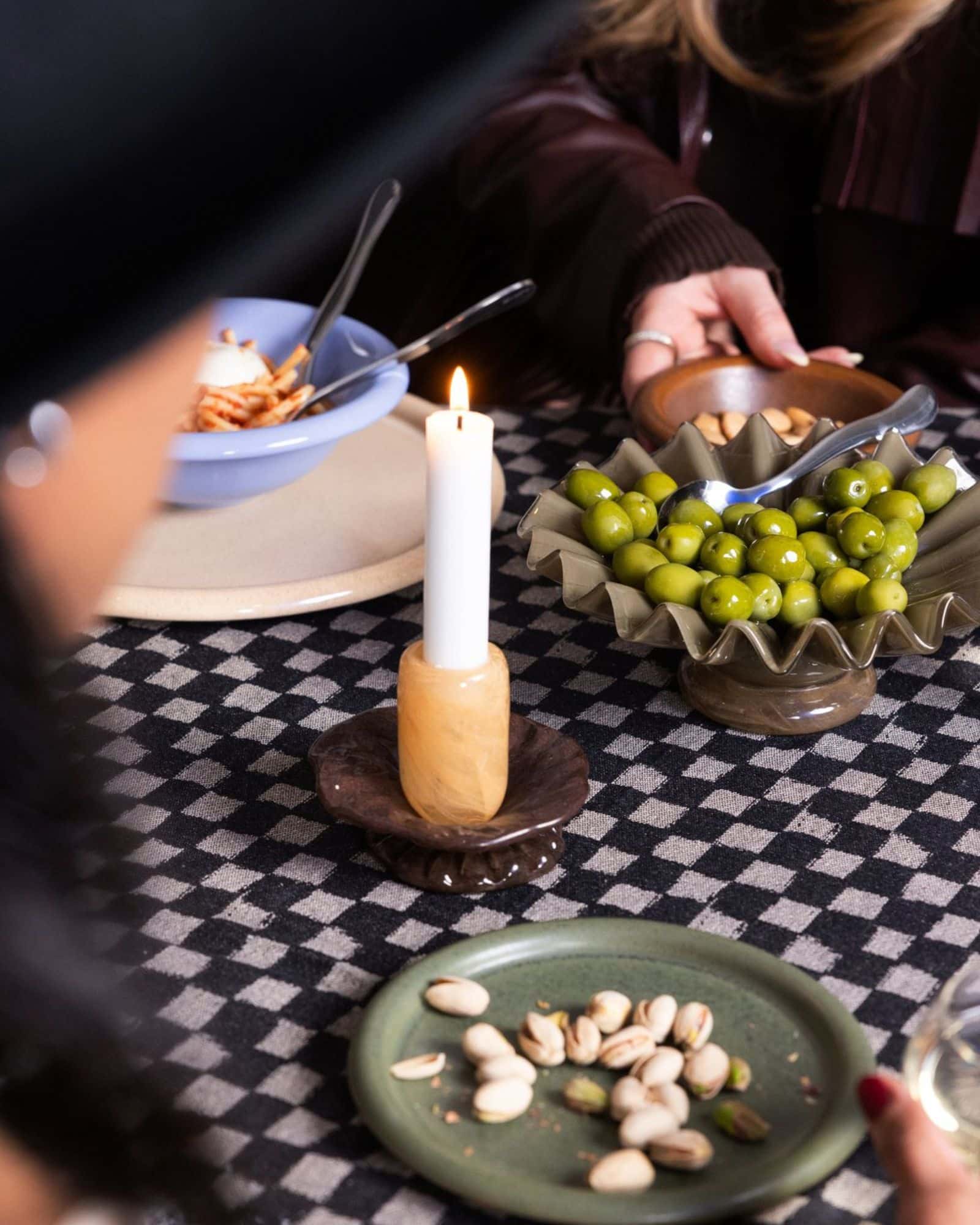 Den glaserade ytan i grönt och beige skapar en spännande kontrast mot den rundade, låga foten. Tillsammans ger det ett konstnärligt och samtidigt inbjudande intryck – nästan som karameller inslagna i glansigt papper. Därför gör Lori sig lika bra på ett dukat bord som i en bokhylla eller på ett sideboard. Eftersom varje skål är handgjord, bär den sin egen unika personlighet. Ingen är exakt lik den andra, vilket förstärker känslan av hantverk och autenticitet. Det gör också varje exemplar till ett litet konstverk i sig. Använd Lori för det som passar dig bäst. Lägg i ett värmeljus, smycken, snacks eller låt den stå framme som den är. Den fyller sin plats – oavsett om du använder den till vardag eller fest.