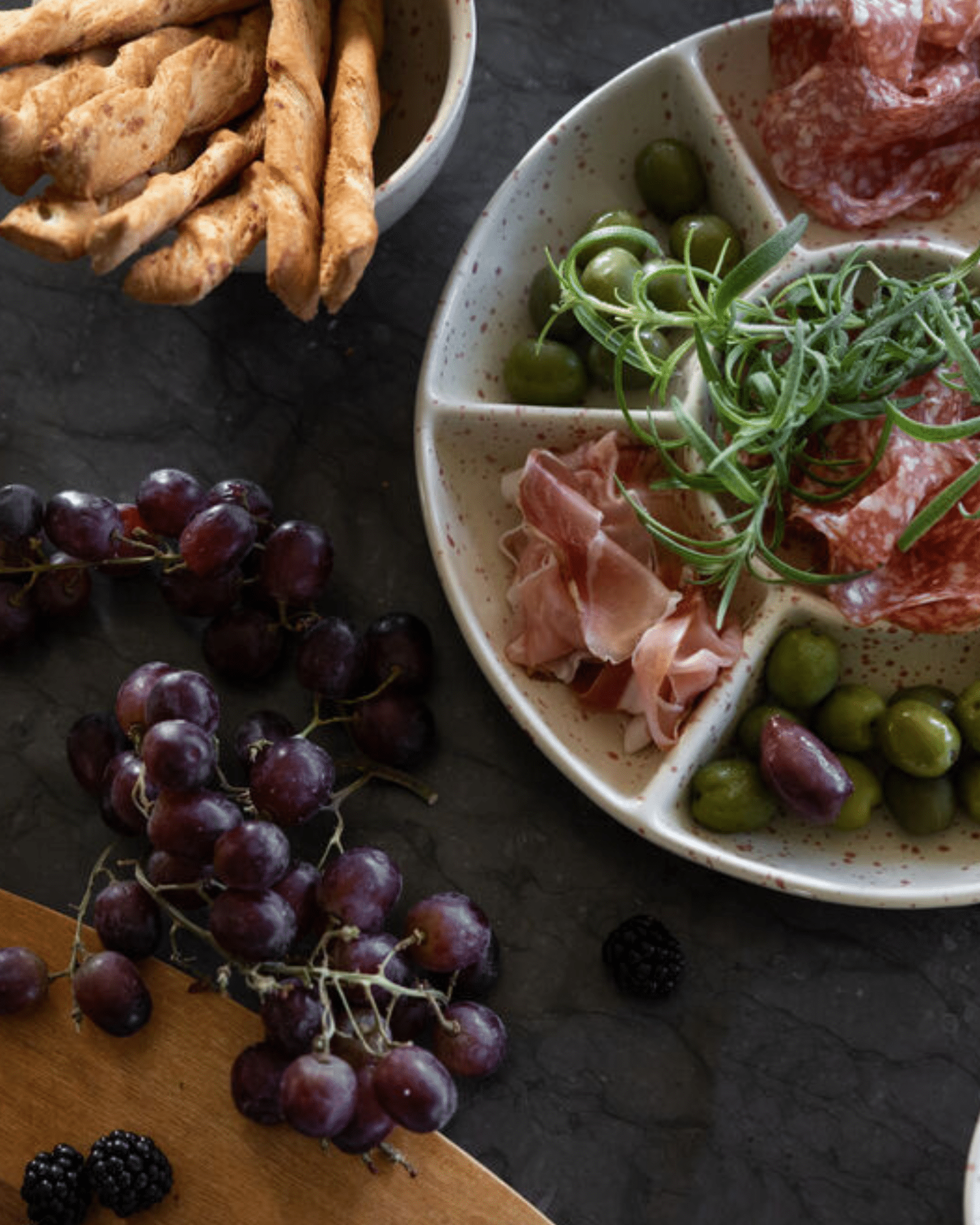 Stilrent och handgjort serveringsfat i stengods, perfekt för tapas, snacks eller plockmat. Den beige basen med vinröda stänk ger en unik och modern känsla till dukningen. Stapelbart, livsmedelssäkert och tål maskindisk – ett praktiskt och vackert tillskott till varje hem.