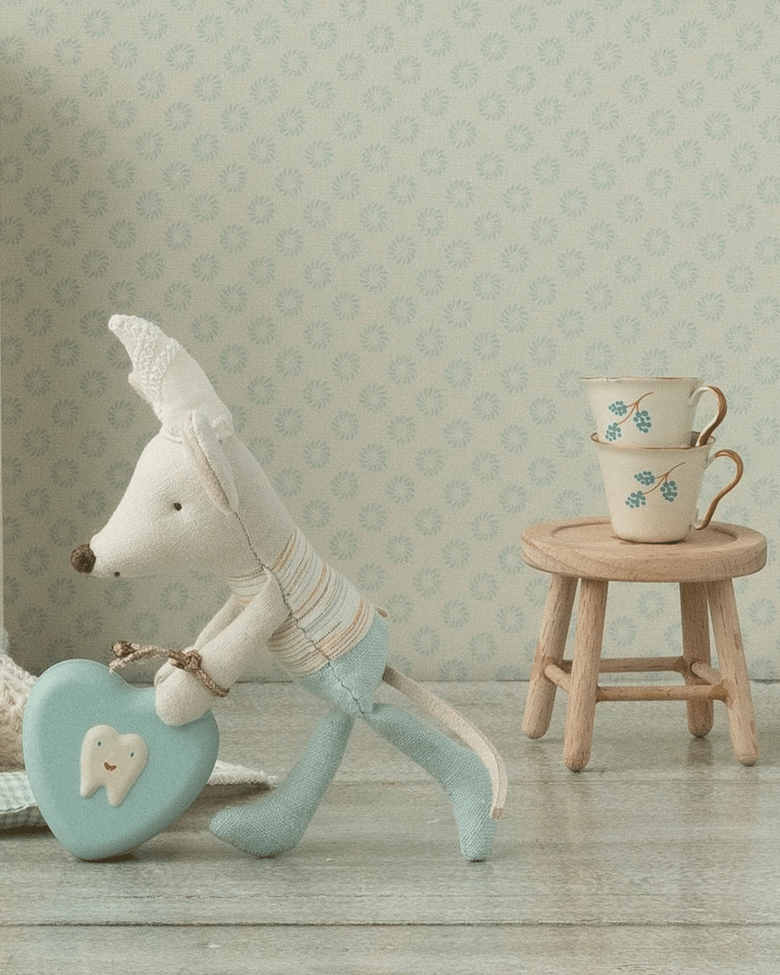 Det lilla bordet och pallen från Maileg är speciellt framtaget för att passa musfamiljens storlek. Dess kompakta mått (5 × 5 × 5 cm) gör att setet får en naturlig plats i alla Maileg-miljöer, men det är särskilt anpassat för Mouse Hole Farmhouse. Här blir det snabbt en del av den mysiga vardagen – oavsett om mössen vill fika, måla, leka eller bara koppla av.