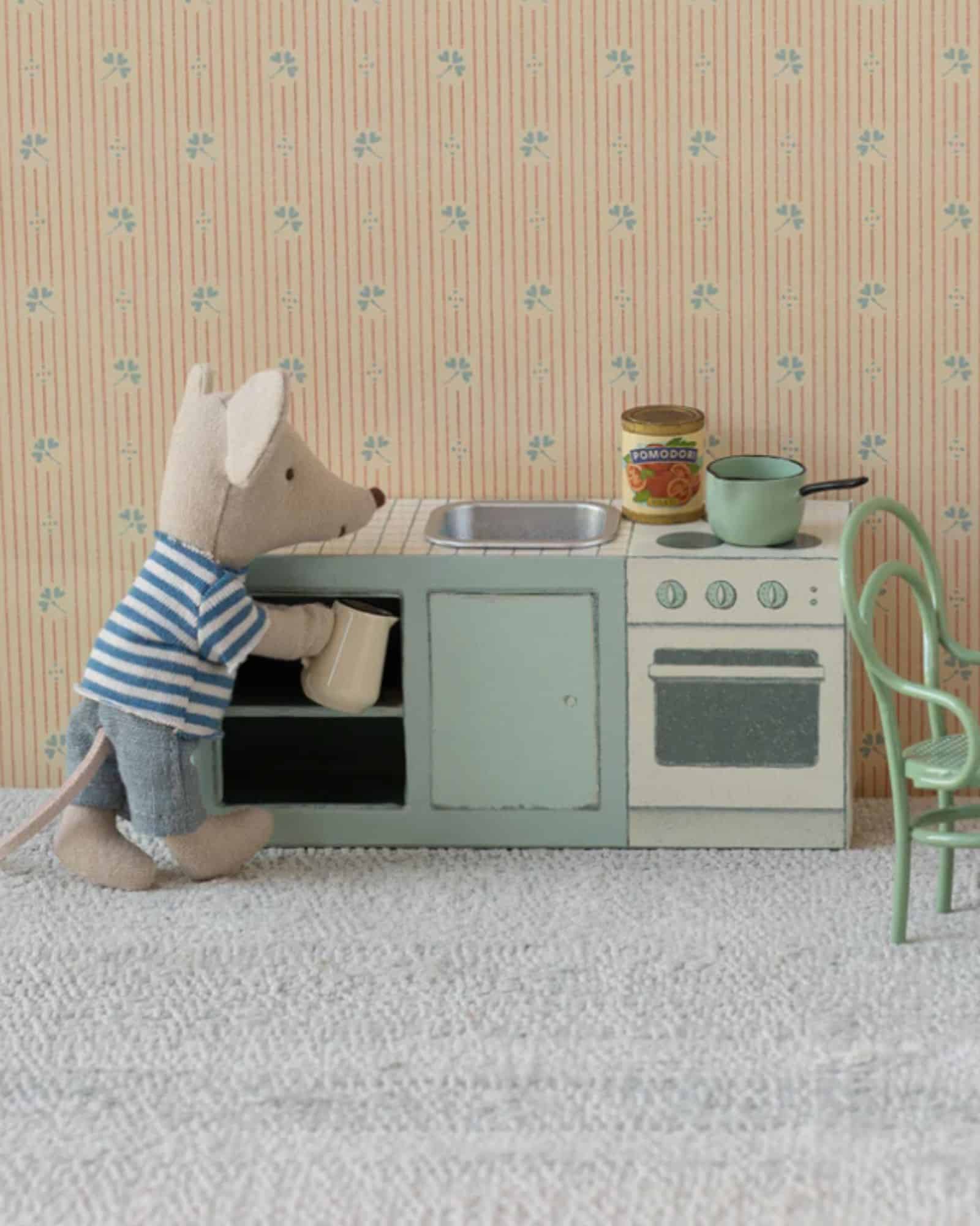 Maileg Köksbänk mus. Maileg Köksbänk Mus skapar en charmig lekplats för små musar i SuitCasa mushus. Den lilla köksbänken levereras komplett med 2 koppar, 2 tallrikar, en kastrull, en kanna och en liten burk, vilket gör det enkelt för barn att låtsas laga mat och duka för sina små vänner.