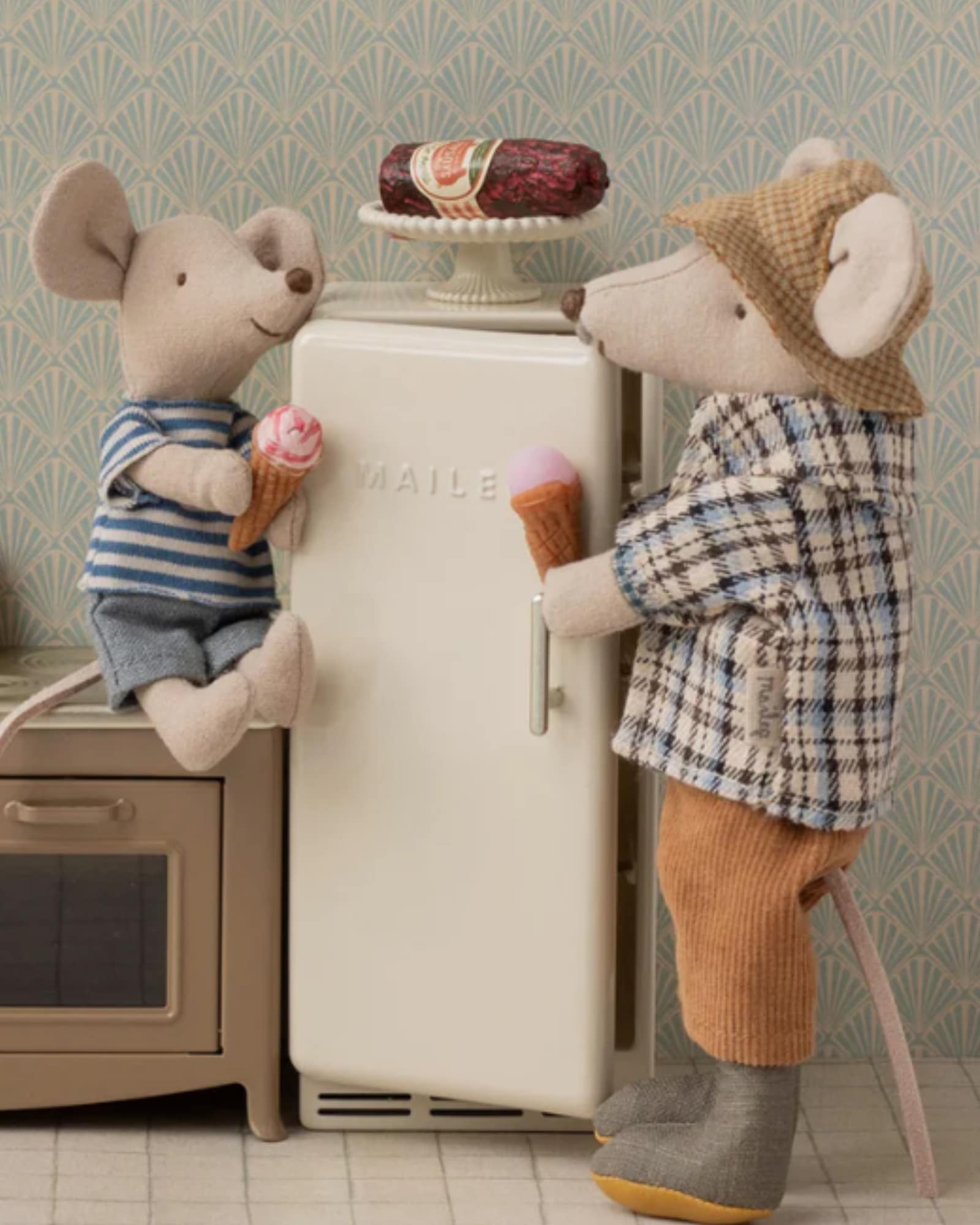 Maileg Morfar mus. Maileg Morfar Mus är en charmig och klok figur som alltid är redo att dela med sig av sina många berättelser. Han bär gummistövlar, byxor, jacka. Vilket ger honom ett lekfullt och autentiskt utseende. Tack vare magneterna i hans händer kan barn enkelt placera honom i olika situationer, hålla i små tillbehör eller interagera med andra Maileg-figurer.