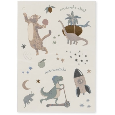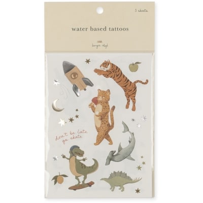 Dra bort skyddsplasten från önskad tatuering och sätt på valfritt ställe. Tryck med en fuktig trasa 30 sekunder ovanpå tatueringen och sedan dra bort!