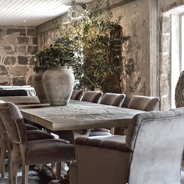 Bordet är tillverkat i helt massiv rustik ek och har behandlats och målats för hand. På ytan ligger ett ofärgat vax. Ytan är len och naturliga grenar och sprickor har lämnats synliga. Detta gör möblerna unika och det finns inte två lika.