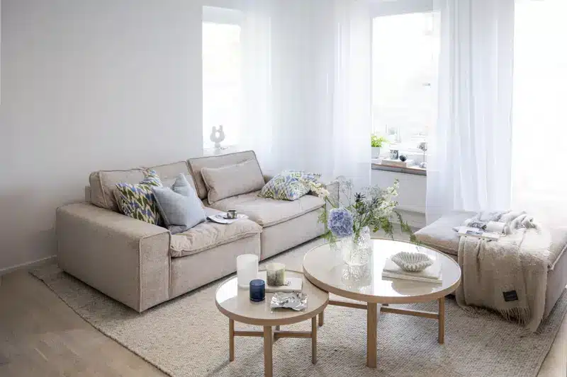 Marsden soffbord Ø90 cm med beige stenliknande bordsskiva i blank keramik ger vardagsrummet en naturlig och elegant atmosfär. Kryssbenen i massiv FSC®-certifierad vitpigmenterad ek i kombination med träkanten runt soffbordet skapar en härlig kontrast. Dessutom är soffbordet lättskött och tåligt mot vätskor och repor tack vare det oömma keramikmaterialet. Marsden finns i två olika storlekar och kan med fördel placeras tillsammans som satsbord för mer flexibilitet. Finns även i brunlackad ek.