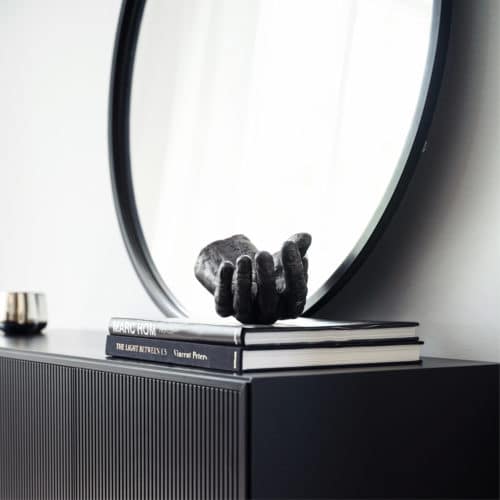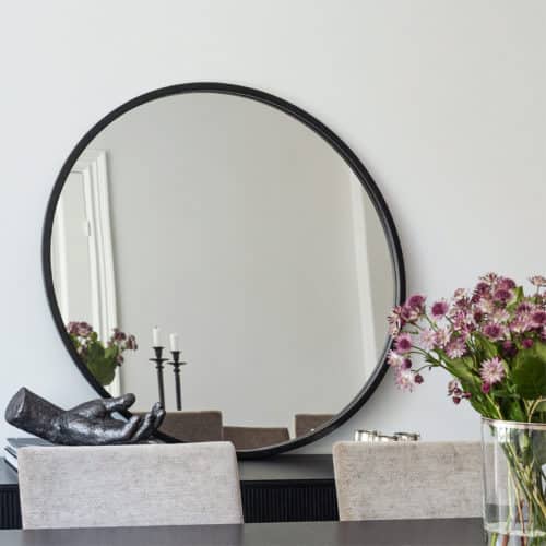 Spegeln finns i  i Black och Grey. Den runda spegeln är lättplacerad i en hall, över ett avlastningsbord eller byrå.