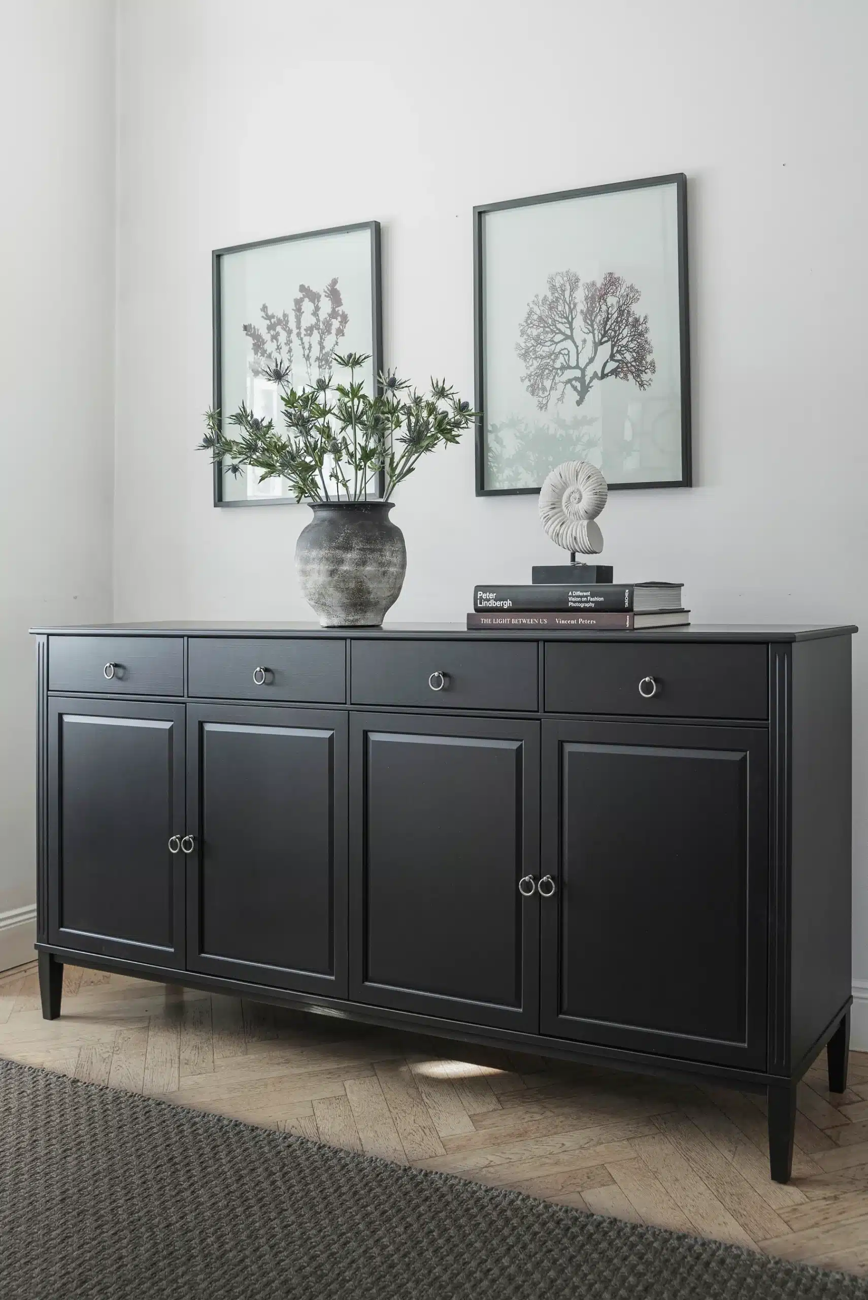 Stockholm 2.0 Skänk/underskåp med gott om förvaring för glas, finporslin, dukar och servetter. De fyra dörrarna öppnar upp till en välorganiserad interiör med justerbara hyllor, vilket ger dig friheten att anpassa förvaringen efter dina behov. Med denna skänk får du inte bara en möbel utan även en vacker detalj som ger din inredning en sofistikerad touch och maximal användbarhet.