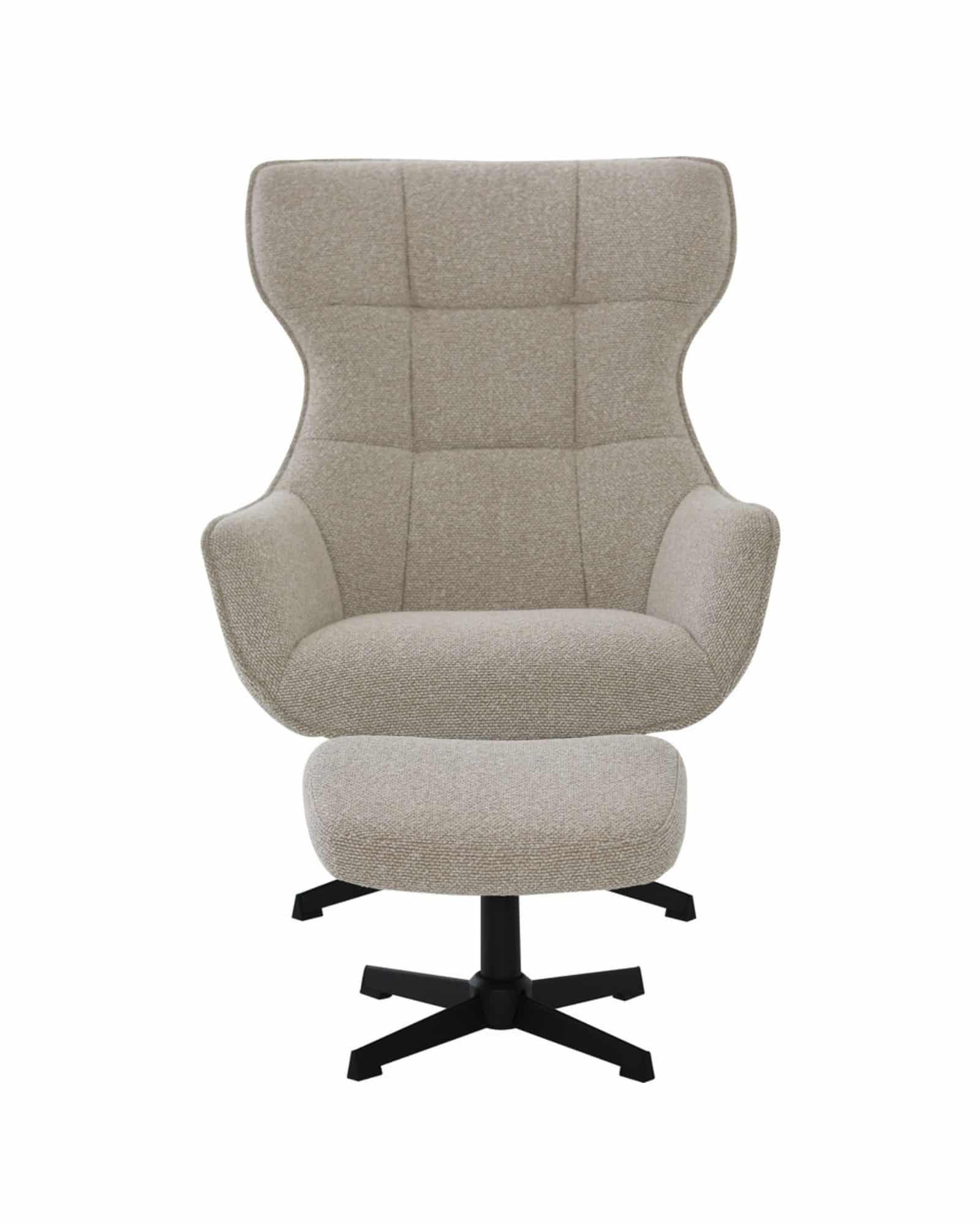 Fåtöljen har snurrfunktion, vilket gör det enkelt att vända sig i den riktning man vill. Den justerbara ryggen gör att du snabbt hittar en bekväm position. Den matchande fotpallen ingår och ger extra avlastning när du vill koppla av.
