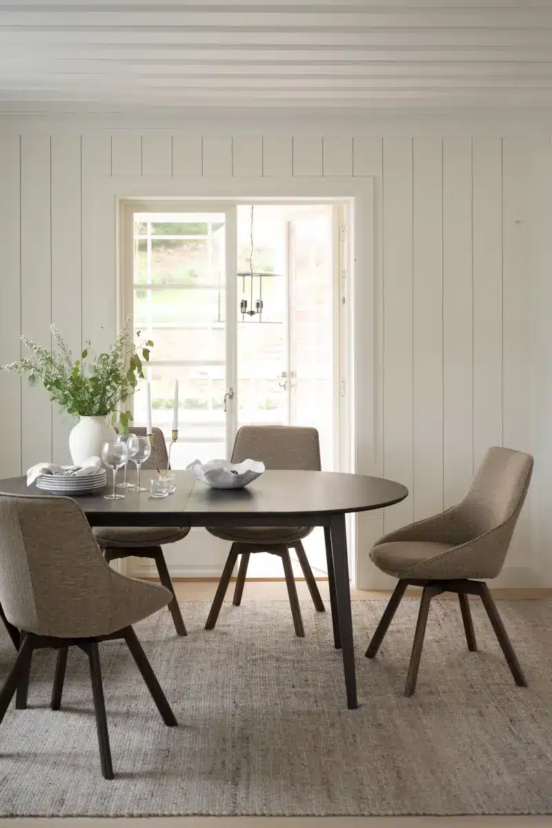 Populära Alison stol med träunderrede och snurrfunktion. Här syns den i en mörkbeige textil och med ben i lackad brun ek. Alison har en stoppad sits med hög sittkomfort i kupad design och ben med snurrfunktion i 360 grader. Stolen passar perfekt runt matbordet men även som udda stol till skrivbordet. Alison är FSC®-certifierad och finns även i andra jordnära färger.