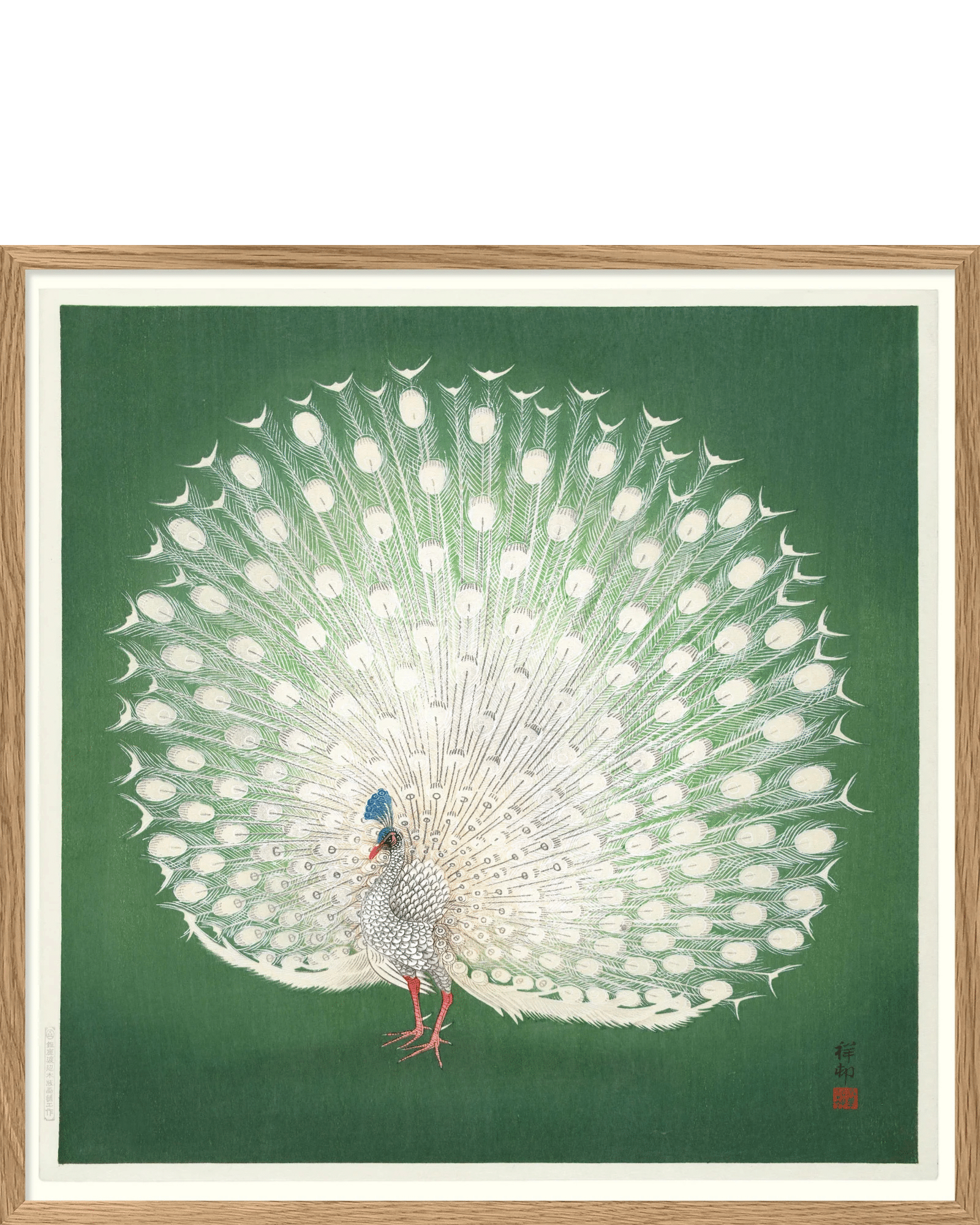 Färgstarkt konsttryck av en praktfull påfågel mot grön bakgrund. Tryckt med japanskt arkivbläck på exklusivt Hahnemühle-papper i vår studio i Danmark.