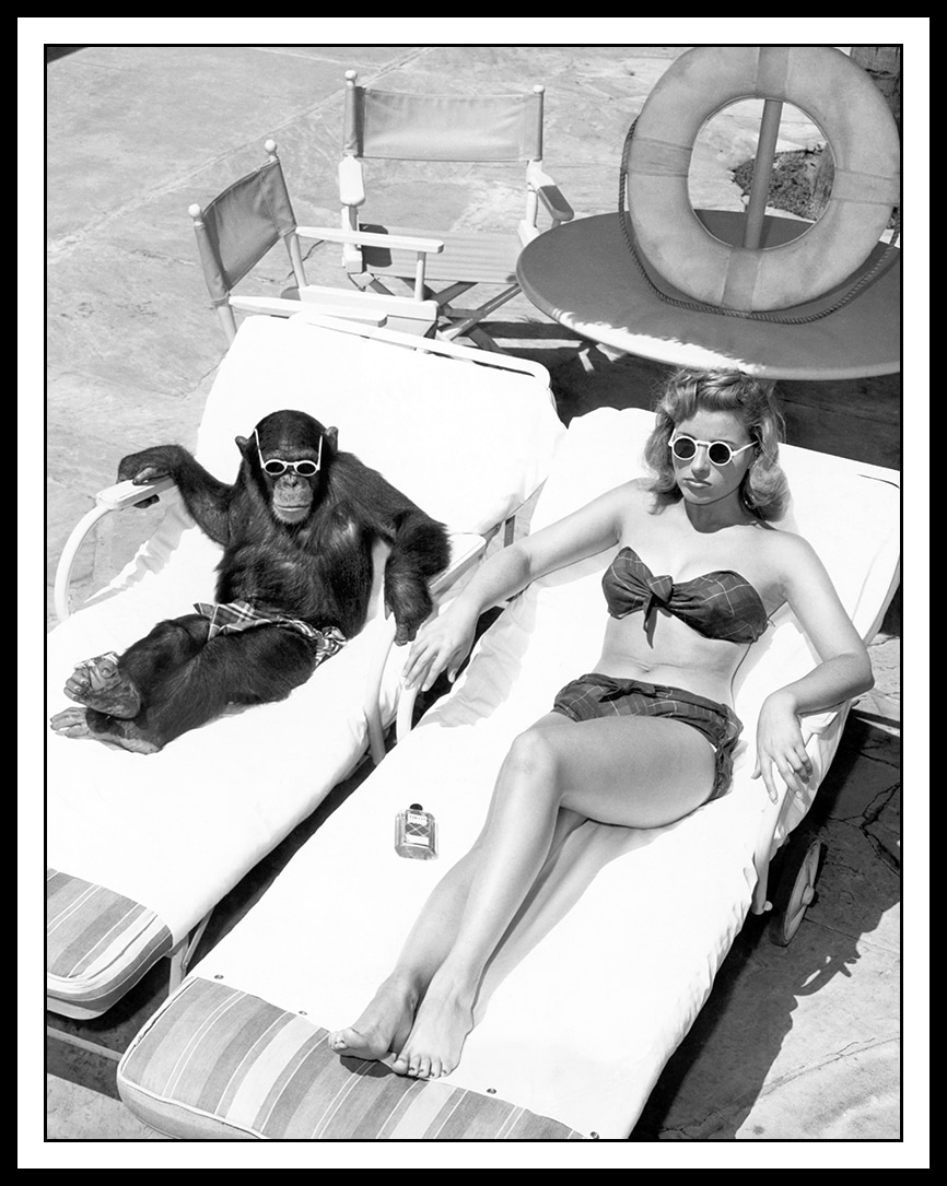 Tavla Sunbathing Monkey, med svart ram och glas.