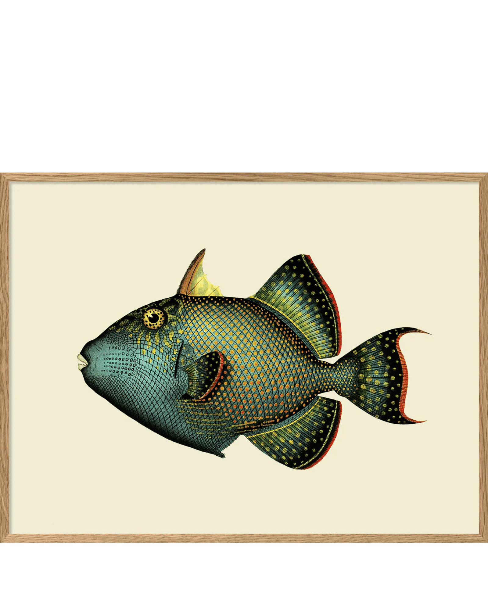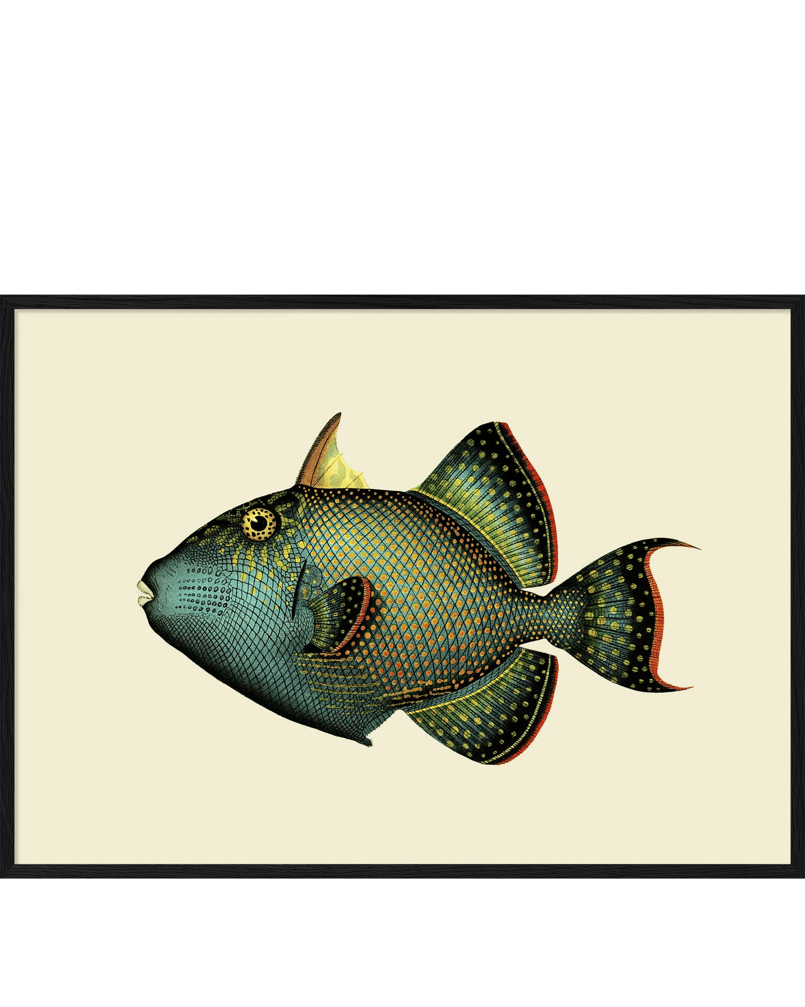 Upptäck skönheten och detaljrikedomen hos triggerfiskar i detta fascinerande konsttryck från The Dybdahl Company. Med sin ovalformade, komprimerade kropp och karaktäristiska stora huvud är triggerfisken en av de mest unika arterna i den marina världen. Trycket fångar djurets distinkta drag, de kraftiga käkarna anpassade för att krossa hårda skal och de små ögonen som sitter högt upp på huvudet, med vetenskaplig precision och konstnärlig känsla.