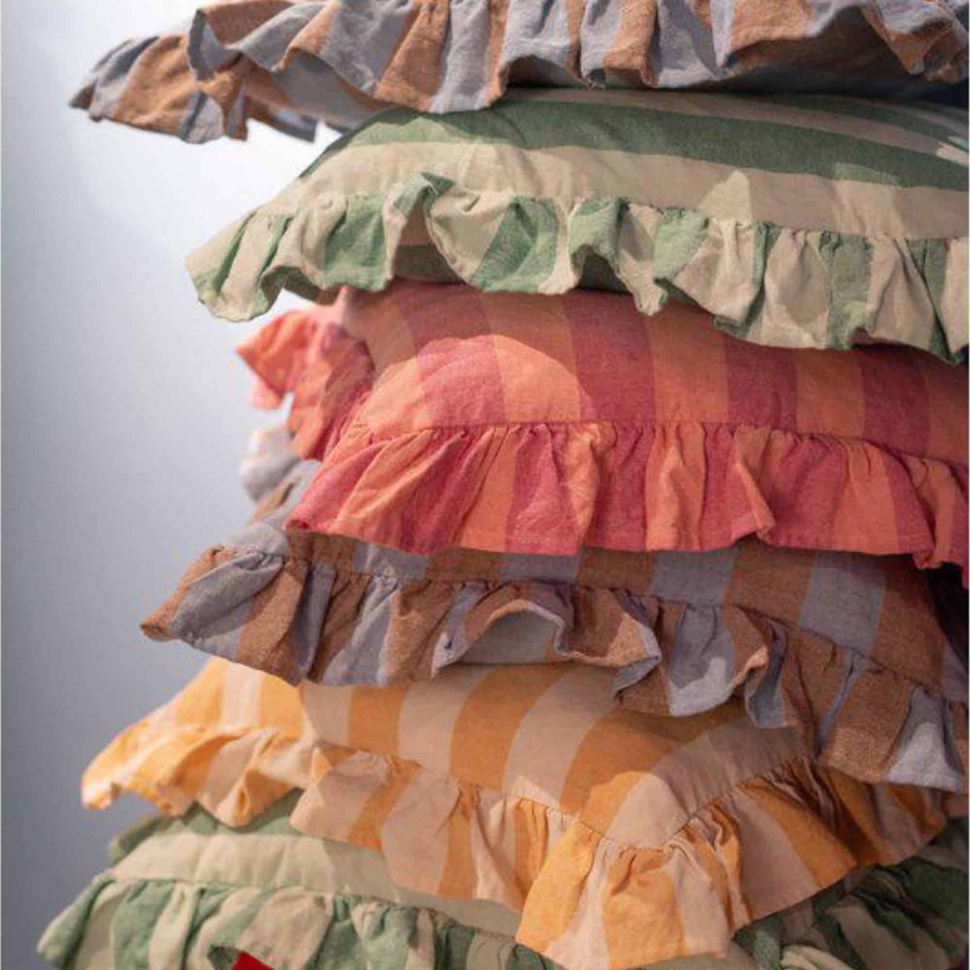 Kuddfodral i fin blockrand med en volangkant runtomkring, tillverkat av en miljövänlig blandning av återvunnna material.