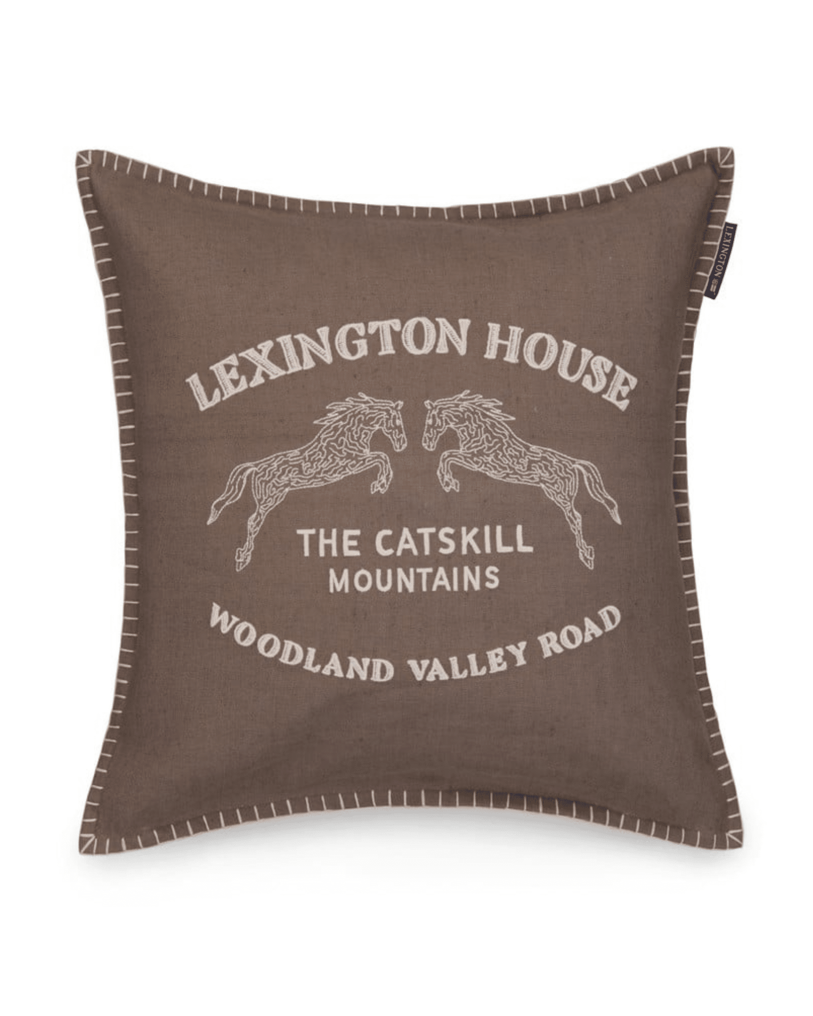 Det stilrena, ljusbeige fodralet pryds av ett fint broderat motiv med texten ”Lexington House – Catskill Mountains”, som hyllar varumärkets arv och förmedlar en känsla av naturnära, rustik charm. Den dekorativa fålltäcksömmen som löper runt kanterna ger kuddfodralet en extra detaljrikedom och en handgjord känsla, medan den dolda dragkedjan i botten säkerställer ett snyggt och prydligt intryck utan störande detaljer.