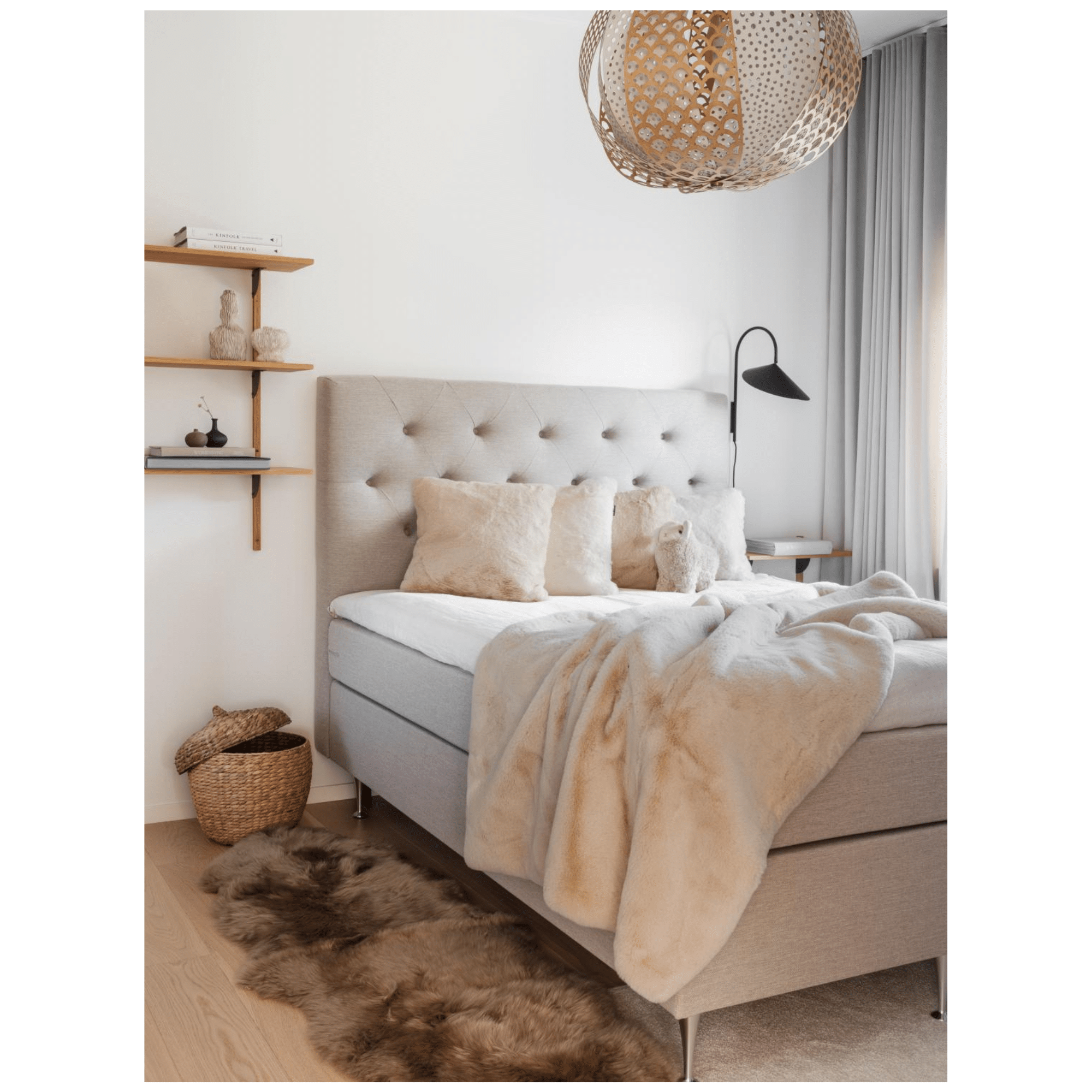 Baksidan är klädd i matchande plysch vilket ger extra komfort och en lyxig känsla när du lutar dig mot kudden. Fluffy Kudde Beige är en del av Skinnwilles Fluffy-serie. Den kan kombineras med plädar och fällar i samma serie för en harmonisk och enhetlig inredning.