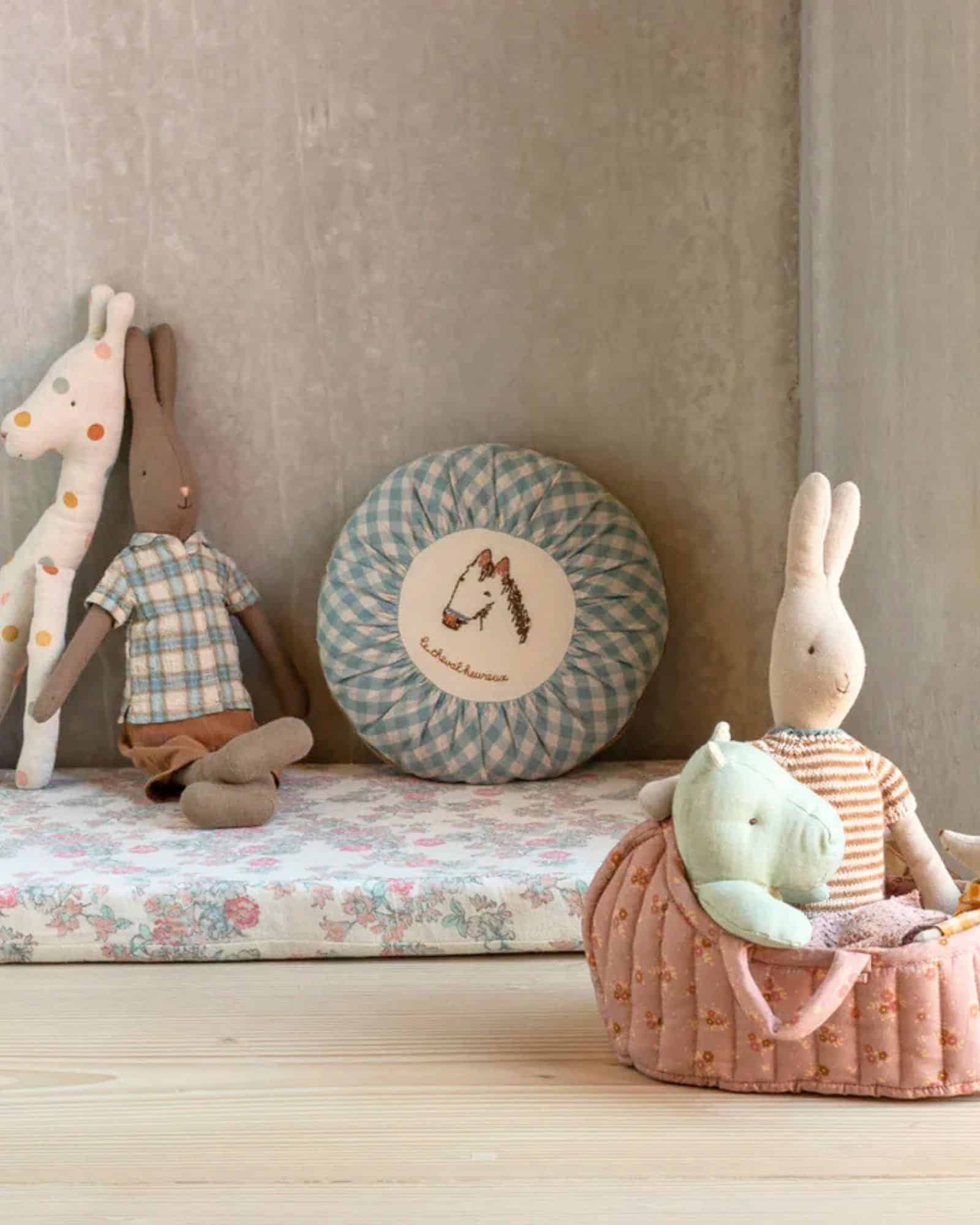 Denna runda kudde från Maileg ger en mjuk och lekfull känsla i barnrummet. Mitt på kudden finns ett charmigt tryck av en ponny som väcker fantasin. Formen är rund och lagom stor, med en diameter på 26 cm. Den passar perfekt i sängen, läshörnan eller på barnens favoritfåtölj. Kuddfodralet är tillverkat i 100 % bomull. Innerkudden har en mjuk och skön fyllning som gör kudden bekväm att vila mot eller krama om. Materialvalet ger både kvalitet och en naturlig känsla. Du kan enkelt använda kudden som en fin detalj för att göra rummet mer hemtrevligt och personligt. Den passar lika bra tillsammans med andra textilier från Maileg som på egen hand. Tack vare sin neutrala färgton smälter kudden in i många olika inredningsstilar. Mailegs lilla runda kudde blir snabbt en favorit bland barnen. Den erbjuder både mys och lekfullhet i ett. Perfekt för barn som vill ha något mjukt och fint att vila sig mot. Tillverkningsland: Kina